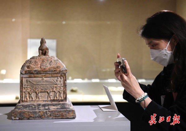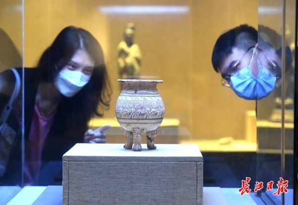 武汉市贞元博物馆展出的宋代磁州窑三足炉吸引观众欣赏。