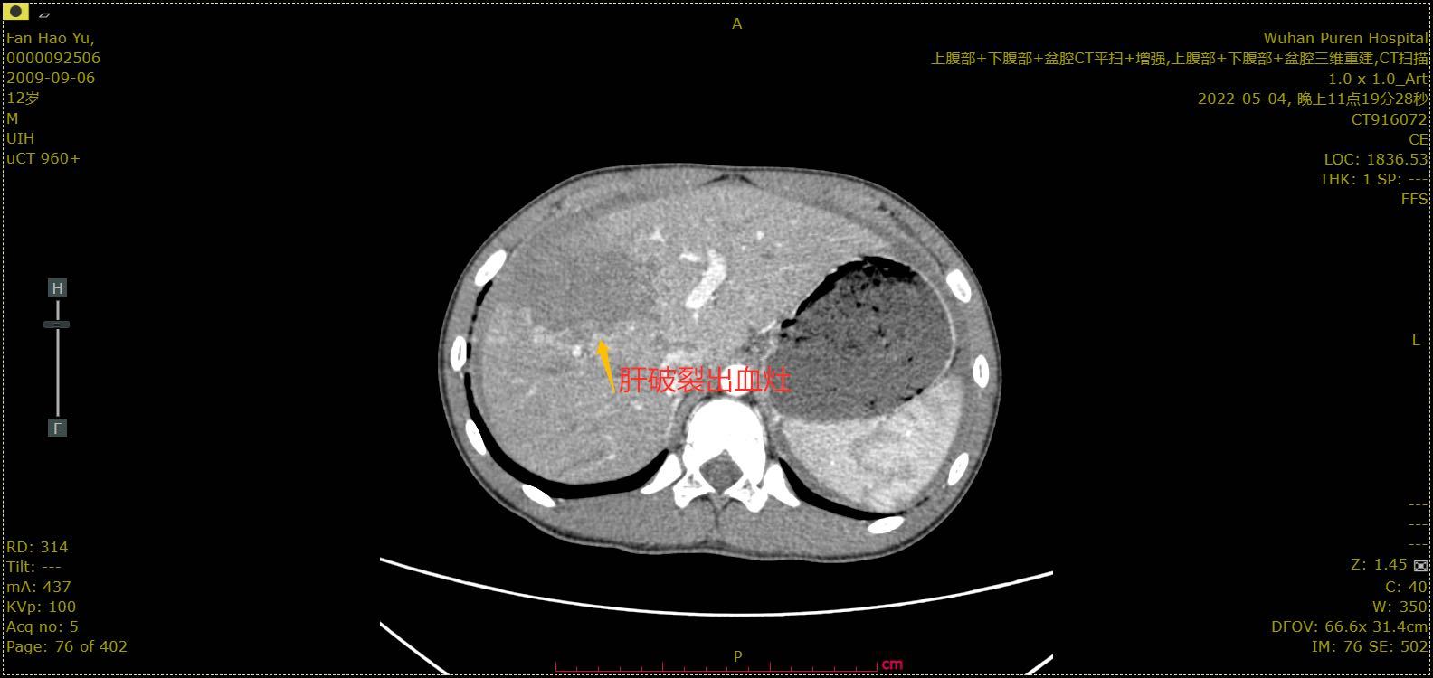 追问下涛涛告诉医生,自行车撞到时,他的右上腹被对方自行车的车把手顶了一下,到现在还隐隐作痛。在医生的建议下,父母带着涛涛做了一个胸腹部的增强CT,结果让家属惊出一身冷汗:肝脏破裂,腹腔大量积血。