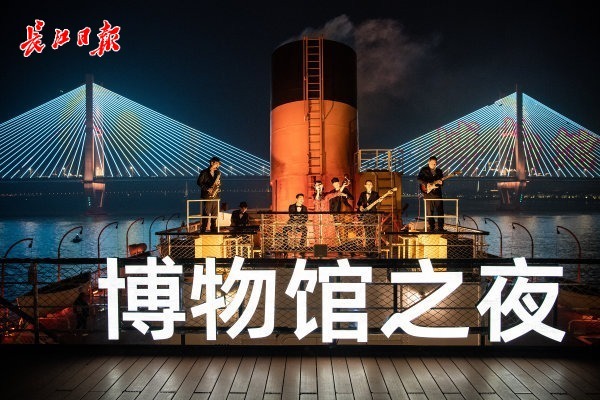 演出接近尾声时,大家登上“知音号”甲板,“国际博物馆日·武汉之夜”专题灯光秀正在两江四岸璀璨上演。伴随着乐队演奏,观众一眼千年,领略光影作用下的博物馆馆藏文物之美,享受一场视听盛宴。