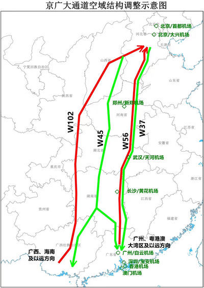 京广大通道全长约2000公里,是全国航路网南北交通大动脉,也是全国最为繁忙的主要干线航路,它涉及京广沿线7省、2个直辖市以及香港、澳门特区,影响145个机场,占全国运输机场总数的57.1%。其中千万级机场8个。
