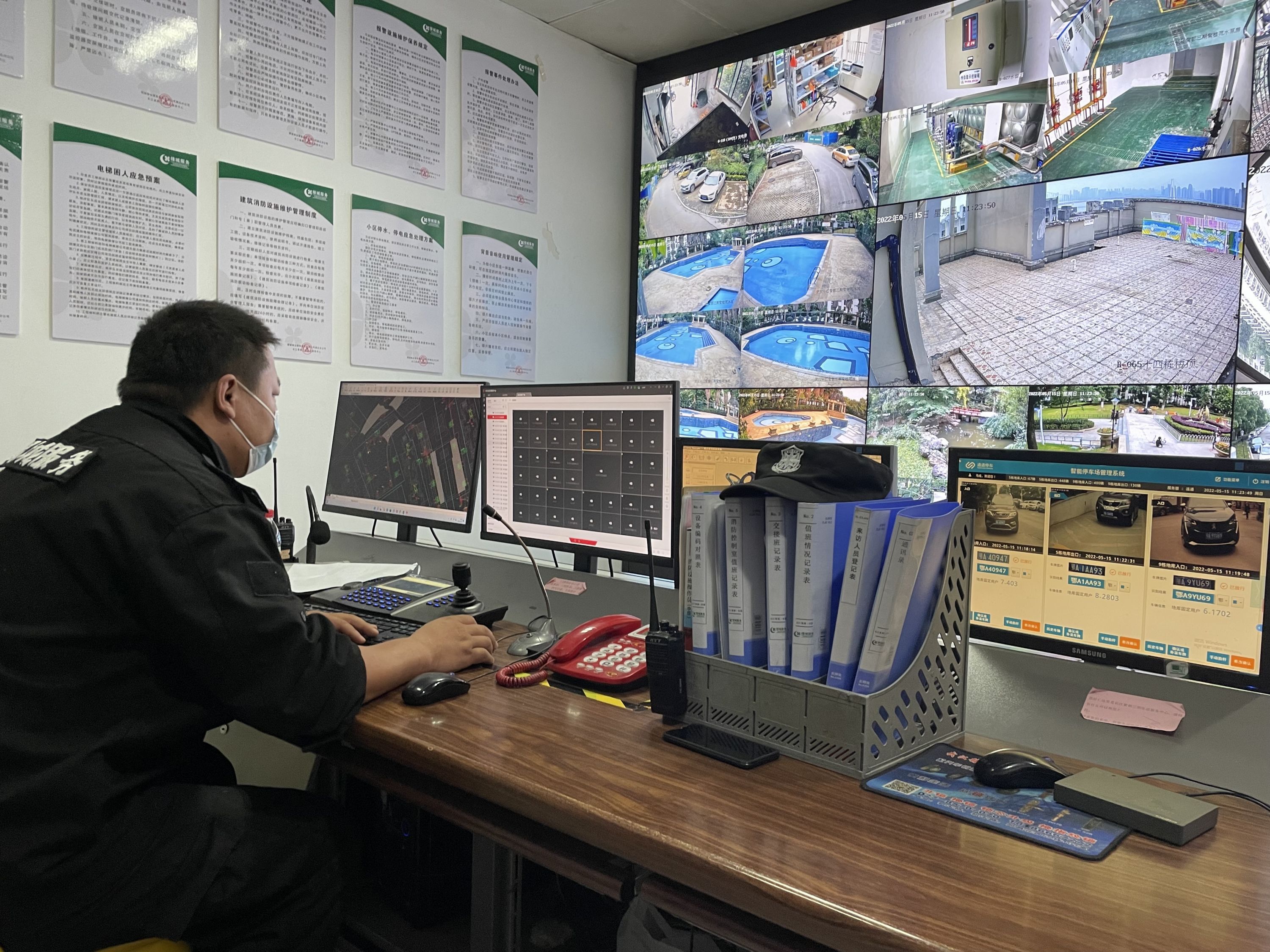 记者观察到,目前整个紫桂苑常规活动区域内,都已经被摄像头无死角覆盖。在小区监控室,整整一面拼接屏电视墙上都是高清实时监控画面;从保护业主隐私角度出发,防高空抛物摄像头拍摄角度多为仰角,画面可以清晰监控到高空抛物行为,却不会拍到居民家中情况。