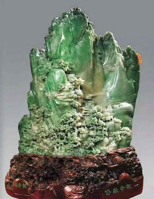 第二件是翡翠山子“岱岳奇观”,用4块翡翠原料中最大的一块制成,原料净重368公斤,高88厘米,呈三棱锥形。作品充分利用原料特点,表现泰山的雄伟壮观、春意盎然,上面还雕了64个人物。背面用铁线篆体雕上杜甫的《望岳》,填以金色,古朴高雅。