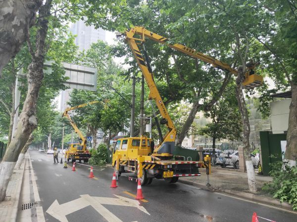 由于停电时间有限,修剪的任务量大,青山园林绿化队派出20余名专业园林技工,出动升降车3台、大型货车1台,对红钢一街、红钢二街的高压线路走廊进行全面摸排,预计将对200余株法桐和樟树进行修剪。