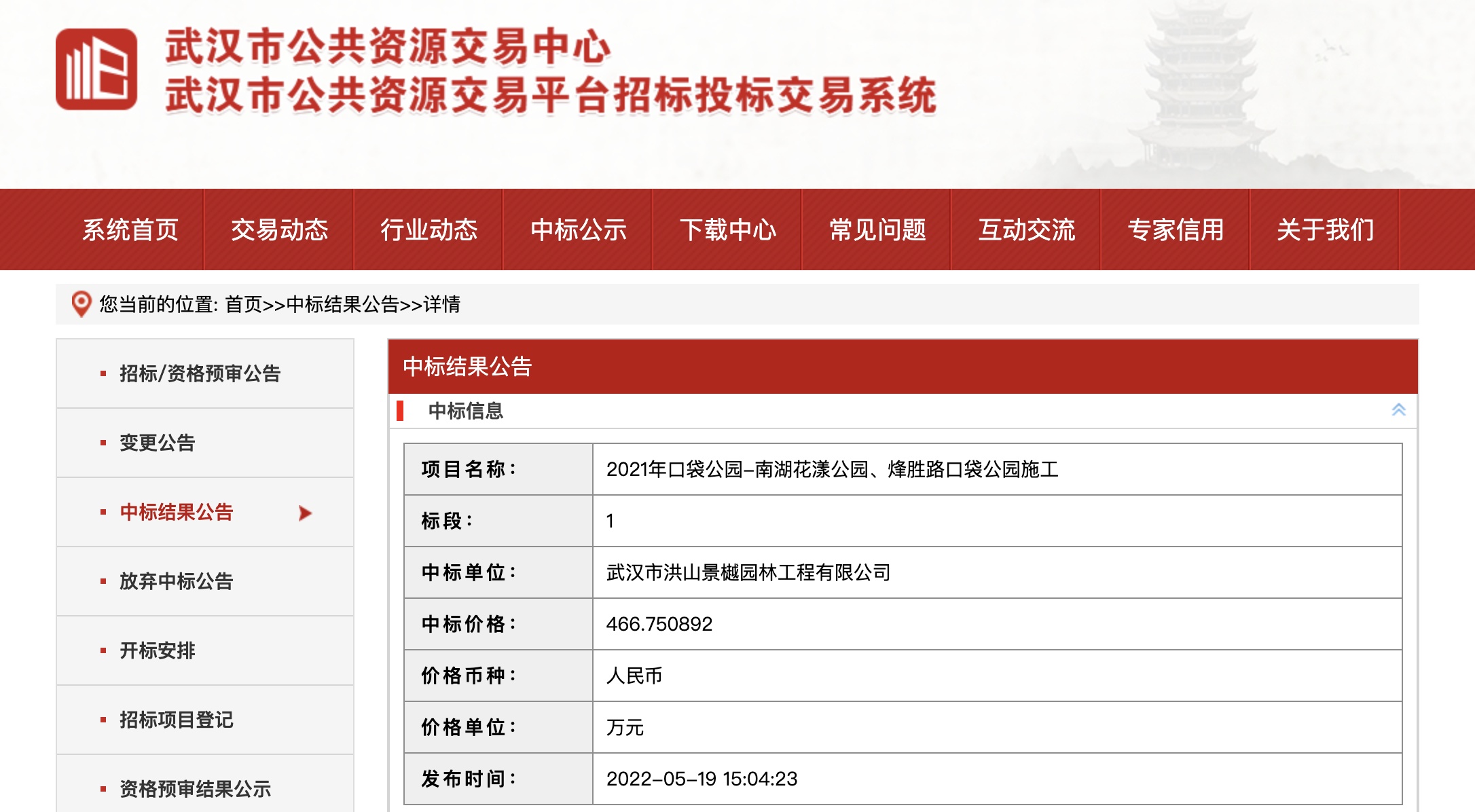 今日,武汉公共资源交易中心发布“2021年口袋公园-南湖花漾公园、烽胜路口袋公园施工”项目中标结果公告。武汉市公共资源交易中心网站信息显示:该项目拟新建南湖花漾公园及烽胜路口袋公园两座社区公园,总用地面积为8195.5平方米。