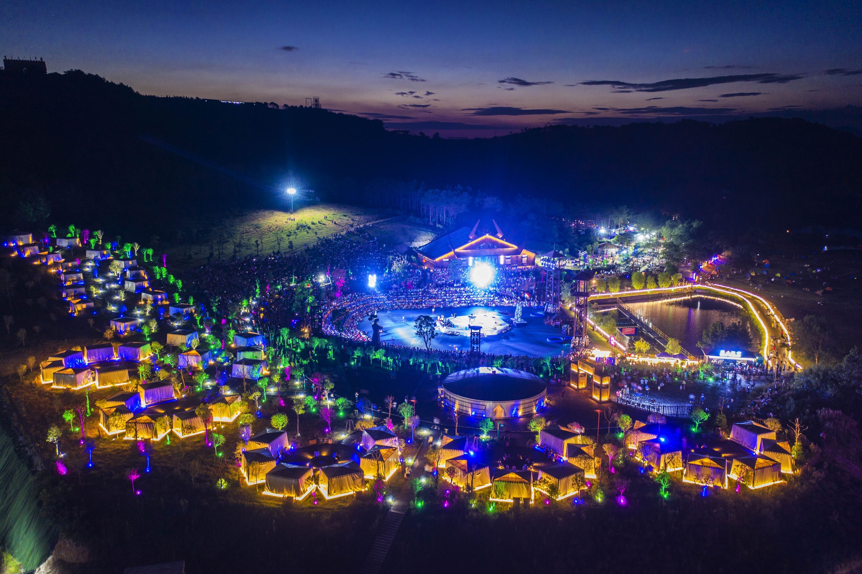 入夜,木兰草原景区的梦栖谷篝火晚会洋溢着火花与音符。木兰花乡景区里在夜晚响起了佤族阿哥阿妹的歌声,在烟火、水幕、杂技等表演过后,游客与演员一起跳起了舞蹈,成为夜游中的美好瞬间。