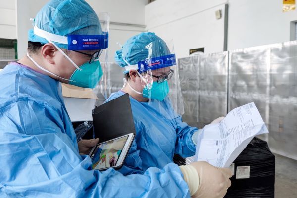 武汉海关关员在机场国际货站查验企业生产所需的重要零部件。