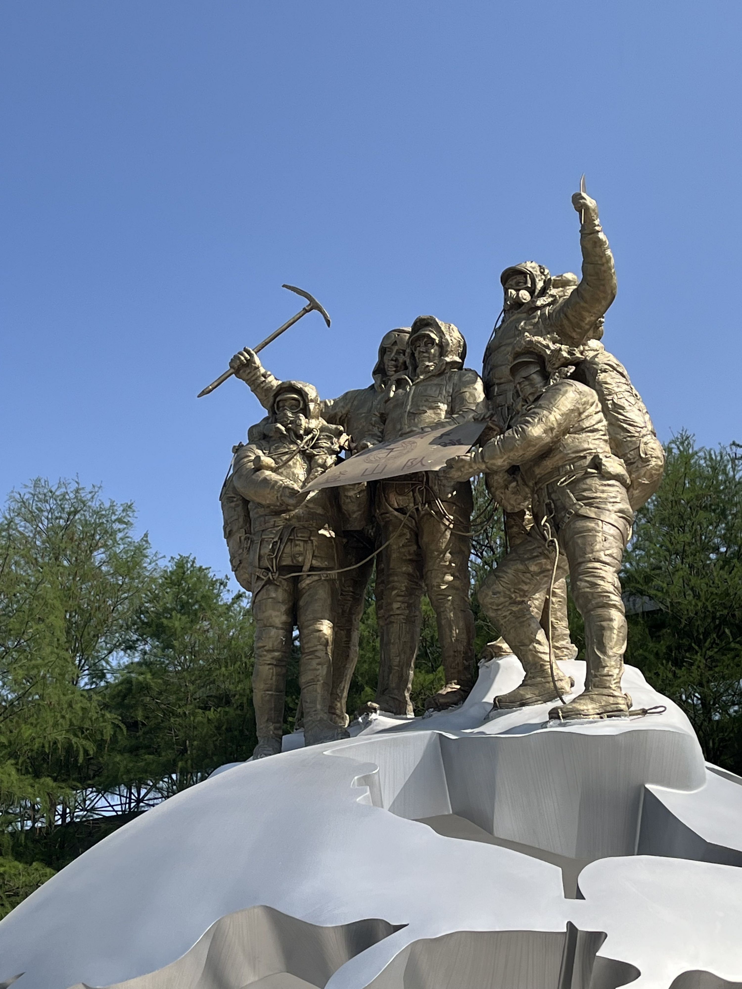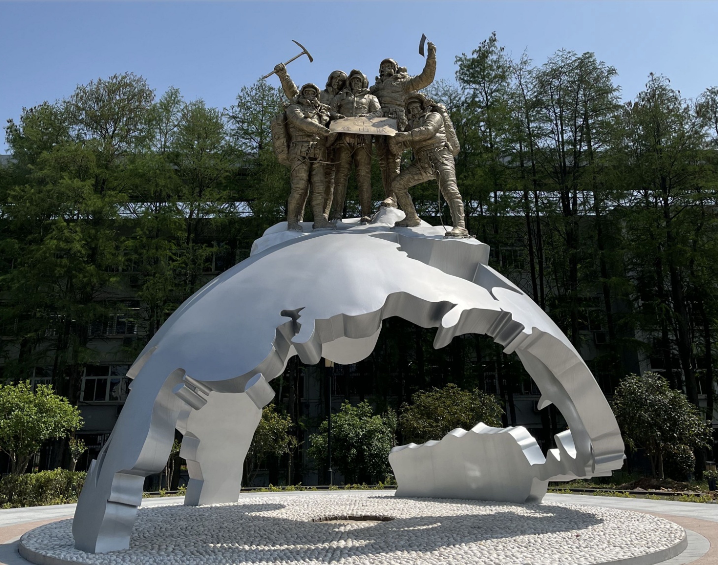 长江日报记者在现场看到,雕塑以登顶珠峰的健儿们为原型,由地球穹顶造型和登山健儿雕塑两部分组成。上方是5位身着登山服、手举“中国地质大学登山队”旗帜的队员们,下方是半镂空的银色半球和白色积雪,象征着地球和白雪皑皑的珠峰。