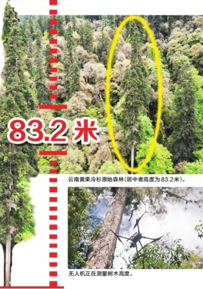 这一发现由中国科学院植物研究所郭柯团队完成。经无人机吊绳多次测量,此次发现的云南黄果冷杉林林冠高度达70米,最高的一株高度83.2米、胸径207厘米,高度超过了此前曾报道的位于西藏的不丹松(76.8米)和位于台湾省的台湾杉(81米至82米)。