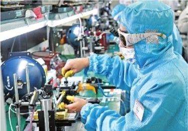 锐科激光生产车间身着防尘服和保护眼镜的员工在各自岗位上精心操作仪器设备抓紧生产。