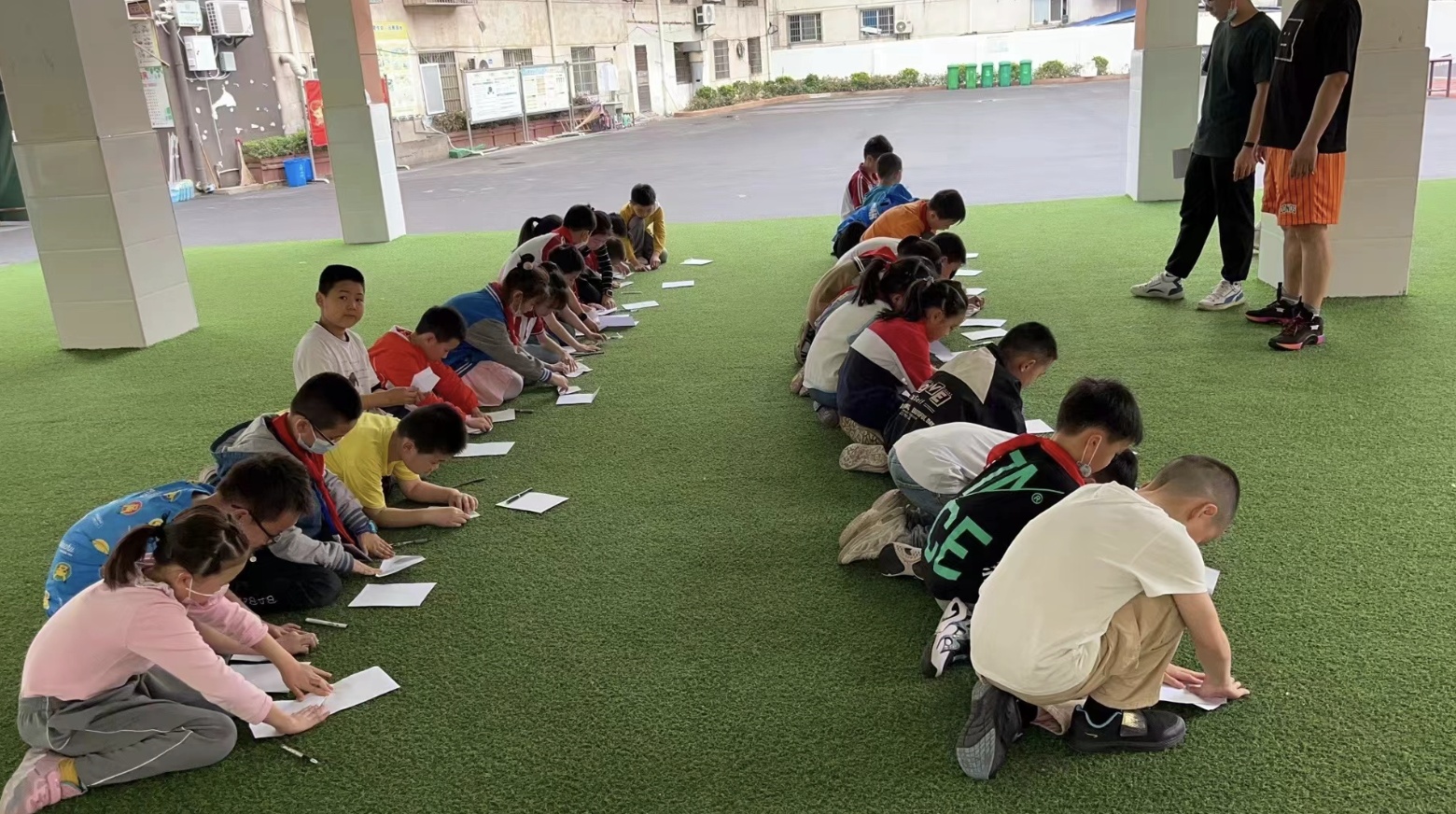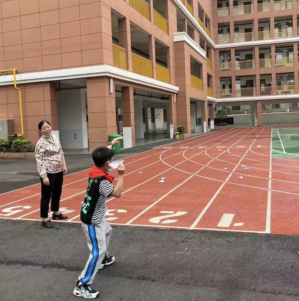 比赛现场,不少同学只用几十秒的时间就能折好一架纸飞机。在学校操场的红色赛道上,三人一组展开激烈比拼,一架架纸飞机盘旋飞过。六年级(11)班的窦欣阳用力投掷出他亲手折制的“火箭”式纸飞机后,旁边传来阵阵惊呼:“哇!这个飞得好远!”最终,他以21.5米的成绩夺得全校冠军。