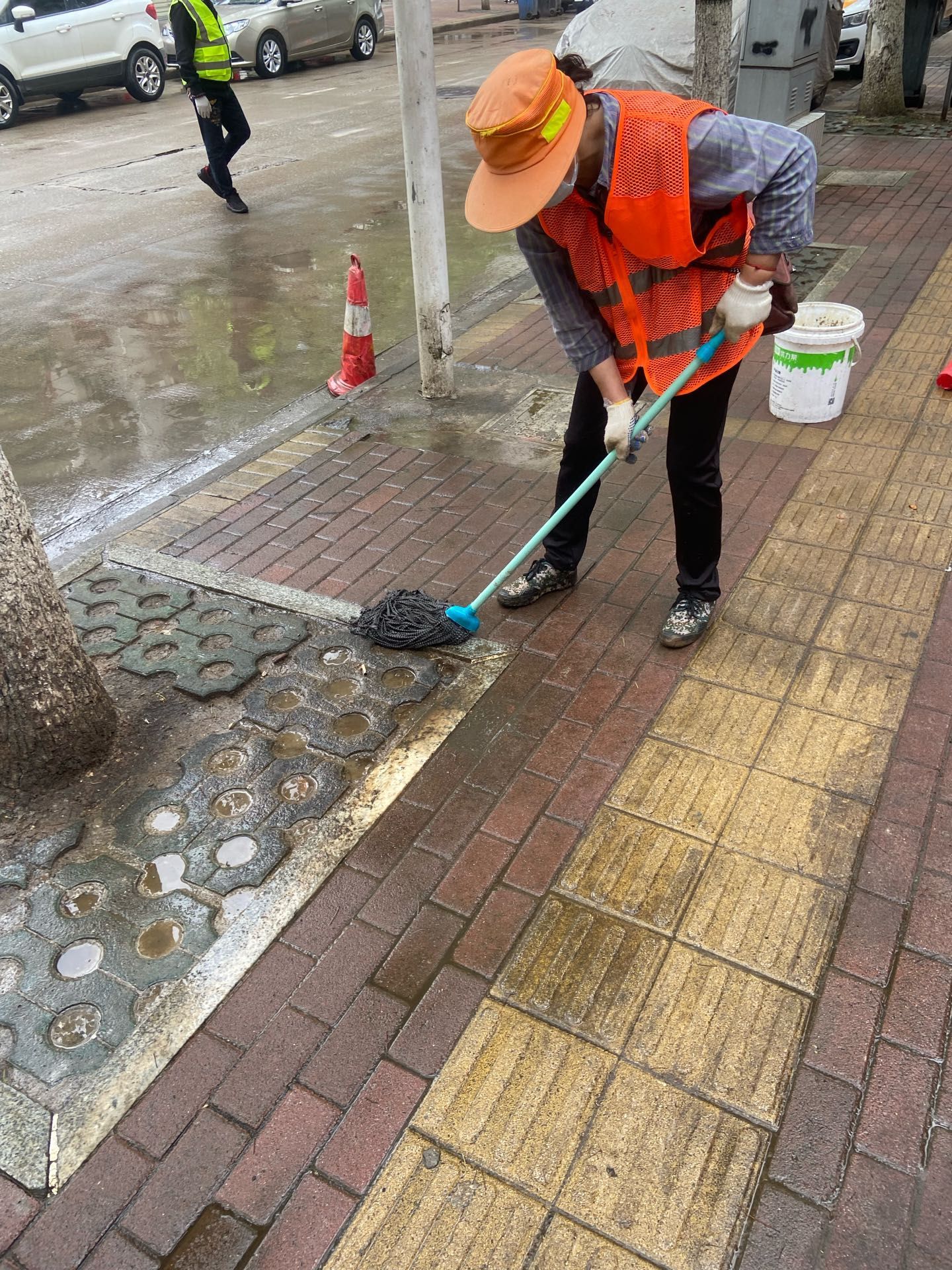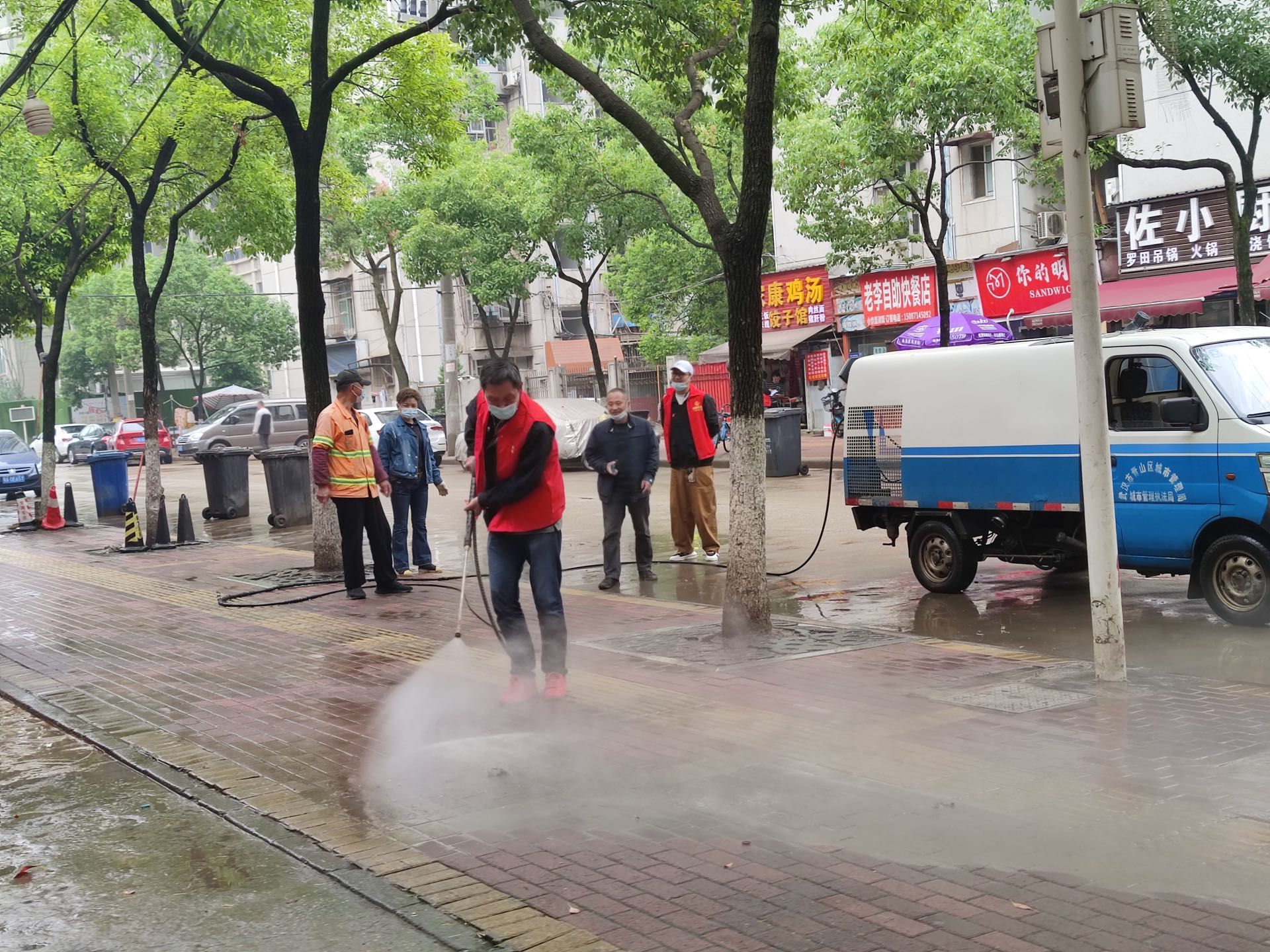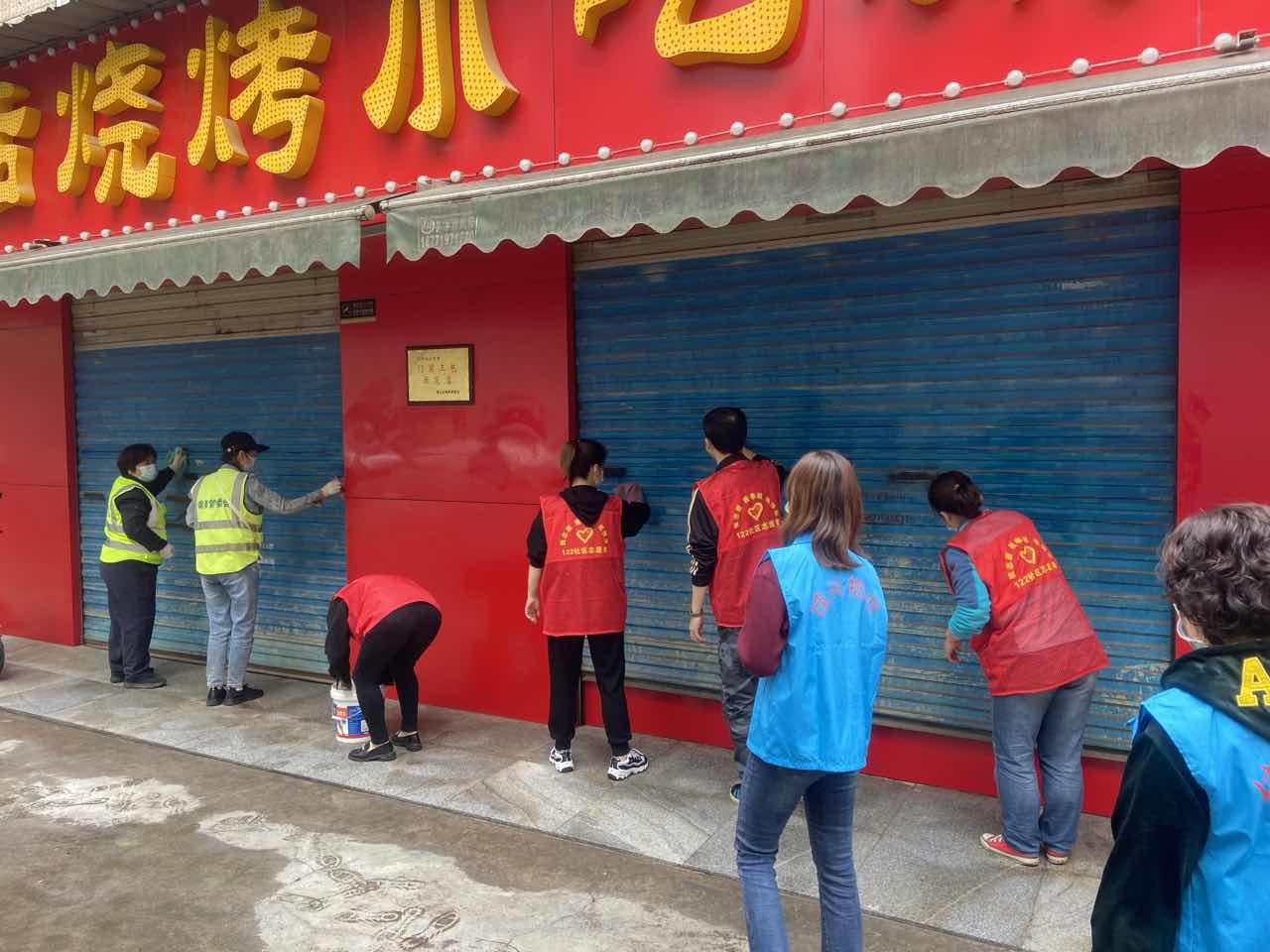 钢都街公共管理办公室、执法中心、区城管委清扫三队、122社区居委会、辖区志愿者等一同参与了活动。各单位、部门分工明确,区城管委清扫三队负责路面的大面积洒水冲刷;公管办“门前三包”督导员带着门店店主、摊主对各自商户门前进行清扫洗刷;社区工作人员负责对墙面油污的清洗保洁;清洗完毕后由执法中心再次向商户宣传法规,要求各店继续做好路面的卫生保持工作。