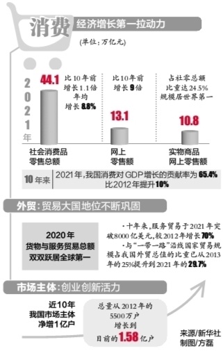2021年我国消费对GDP增长的贡献率为65.4%,比2012年提升10个百分点。盛秋平说,消费对经济发展的基础性作用不断增强,稳定器和压舱石的作用日益显现。