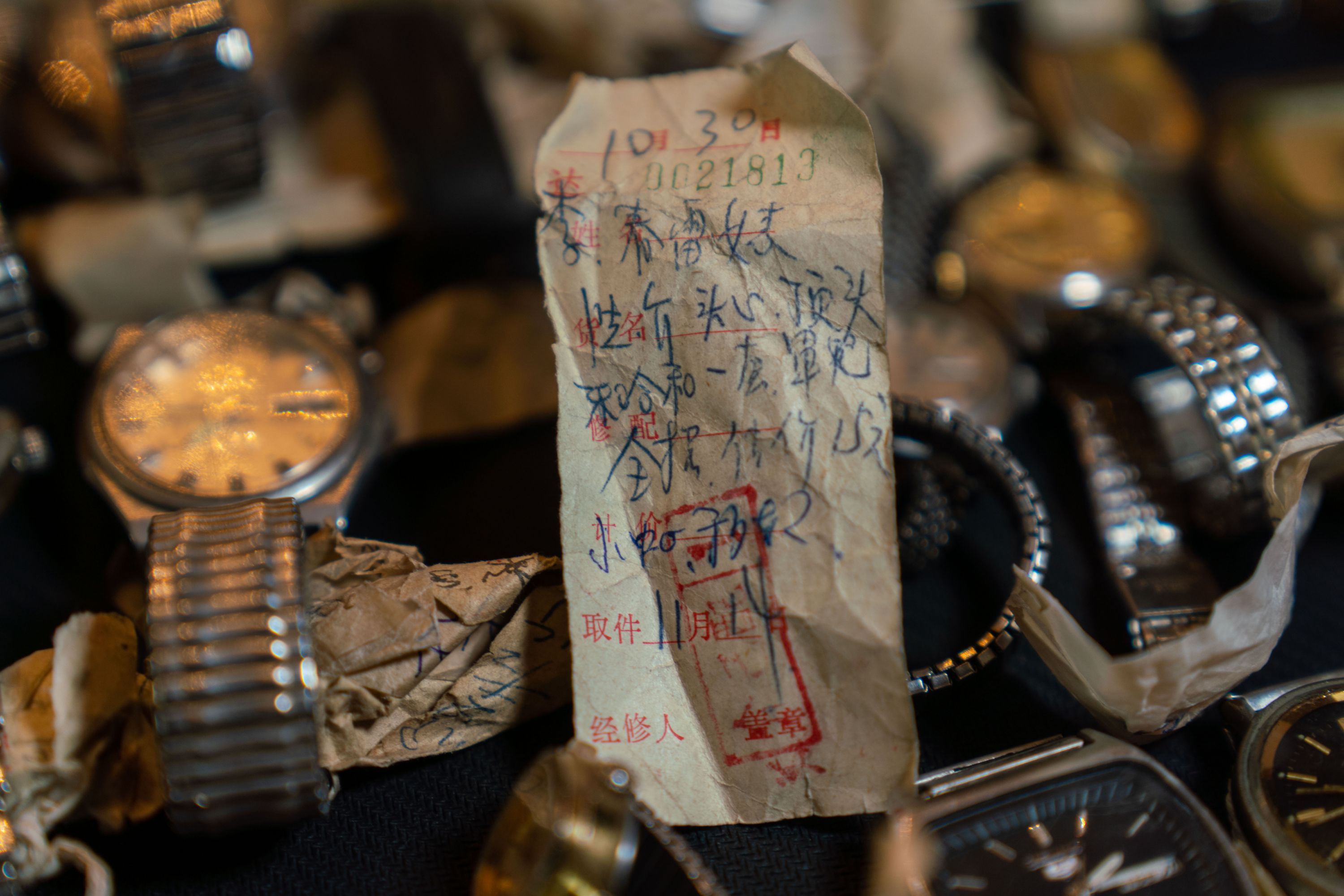 今年是亨达利创始百年。在这家百年老店里,有155块被主人遗忘的手表。手表上绑着的收据存根,有的已经发黄、字迹模糊,但它们依然被小心翼翼地保管着。