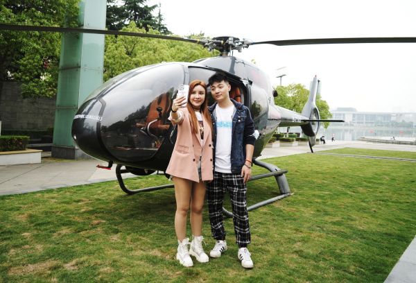 “直升机、热气球、氦气球都可用在婚礼中,给新人带来独特的‘空中婚礼’体验。”据该项目运营方TG婚礼中心董事长徐碧聪介绍,空中飞行带来的全新体验满足了新人们追求告白与婚礼中创新感与专属感的需求,新人提前预约经过报批后就可以为自己的婚礼开启一条城市里的专属航线。“这架直升机曾参与周星驰电影《美人鱼》的拍摄,今后将为新人服务。”徐碧聪在现场介绍道。