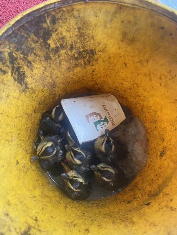民警朱宜国和辅警凃勋赶到现场,在报警人金先生的指引下,看到了一窝共7只“小萌鸭”。民警发现这群小家伙与较常见的鸭子有所不同,其上嘴呈黑色、先端呈黄色,脸部呈黄色与其深色的体色有比较明显的反差。