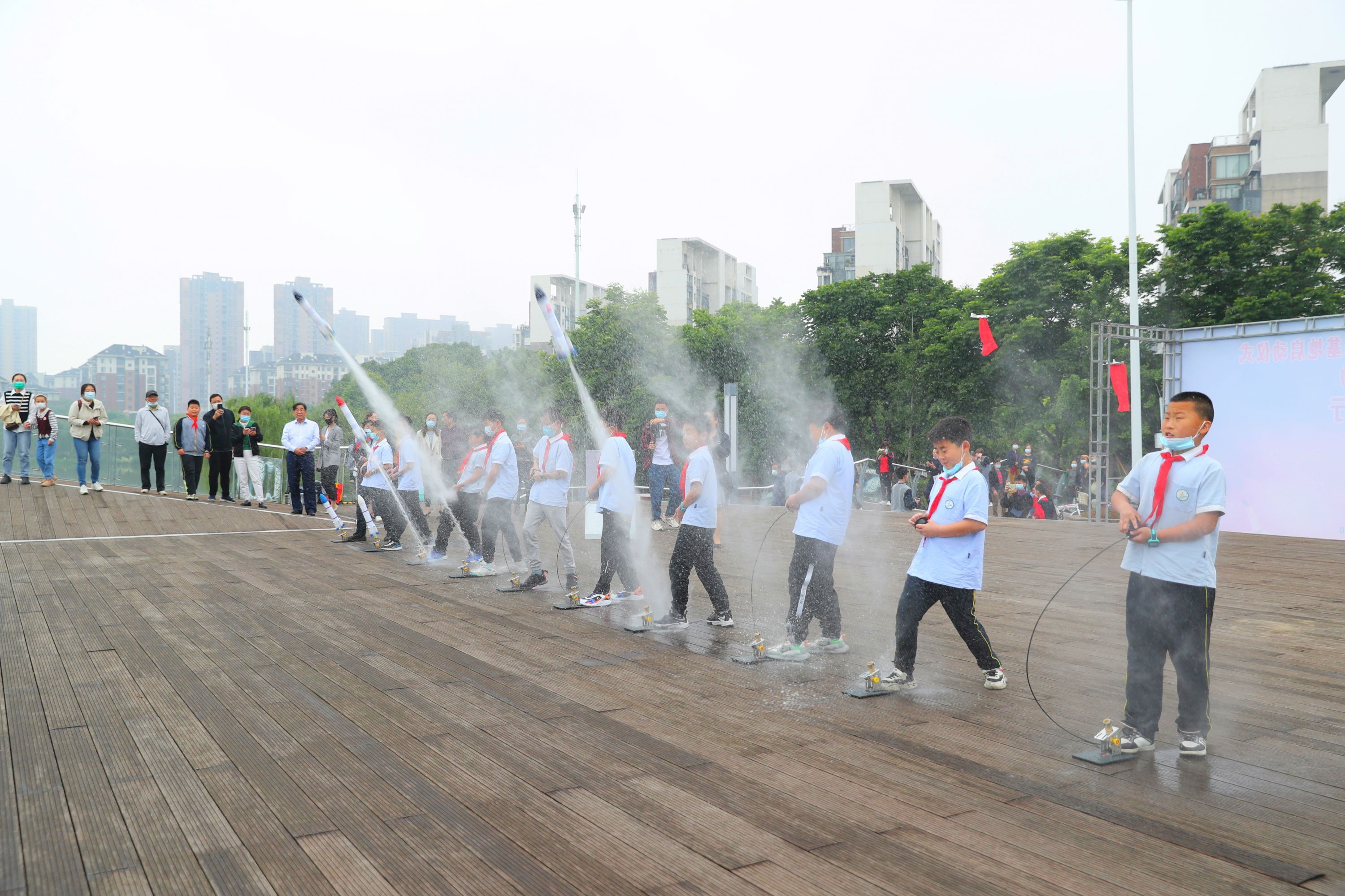 洪山区街道口小学仁和路分校学生现场展示水火箭发射。