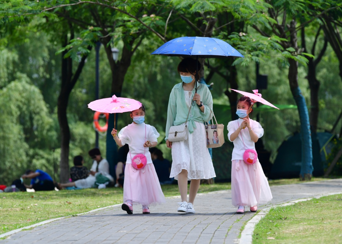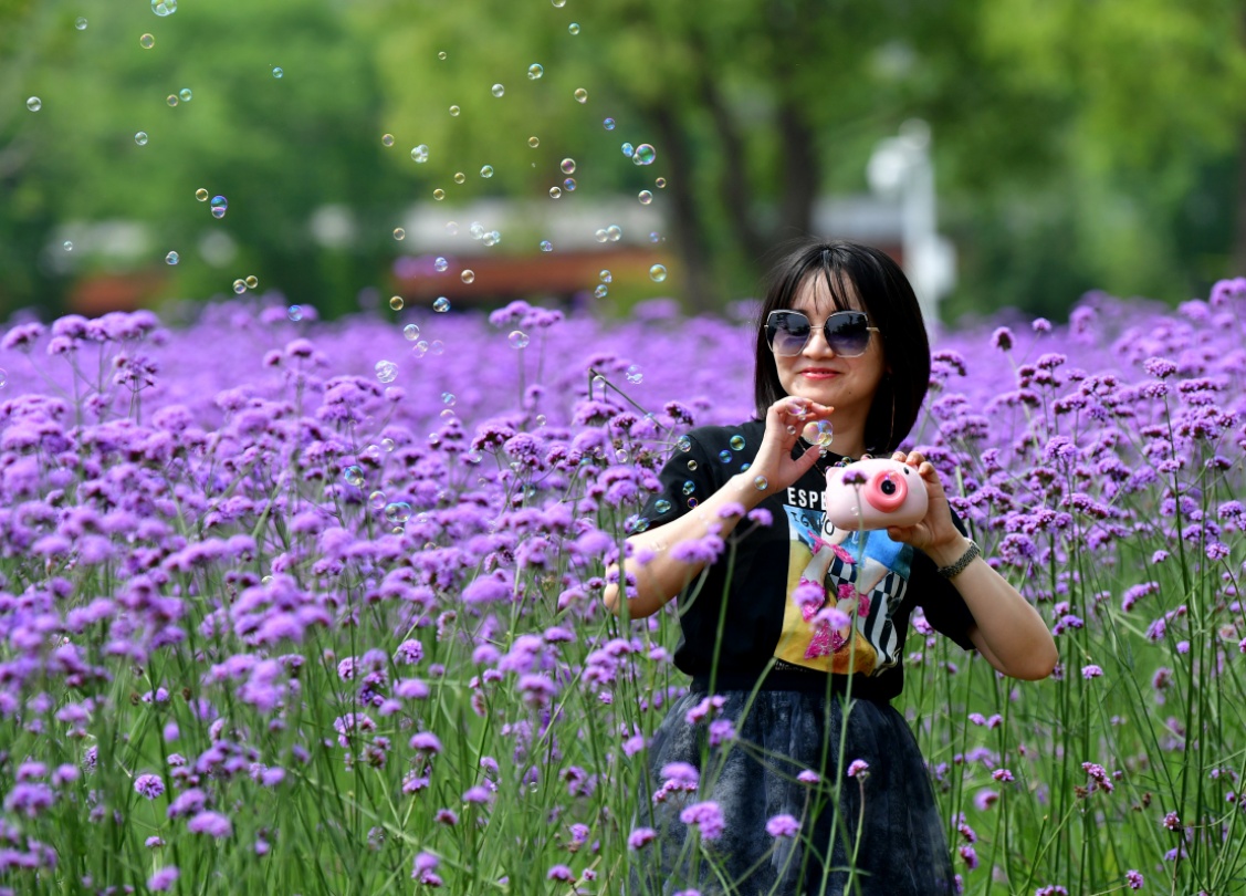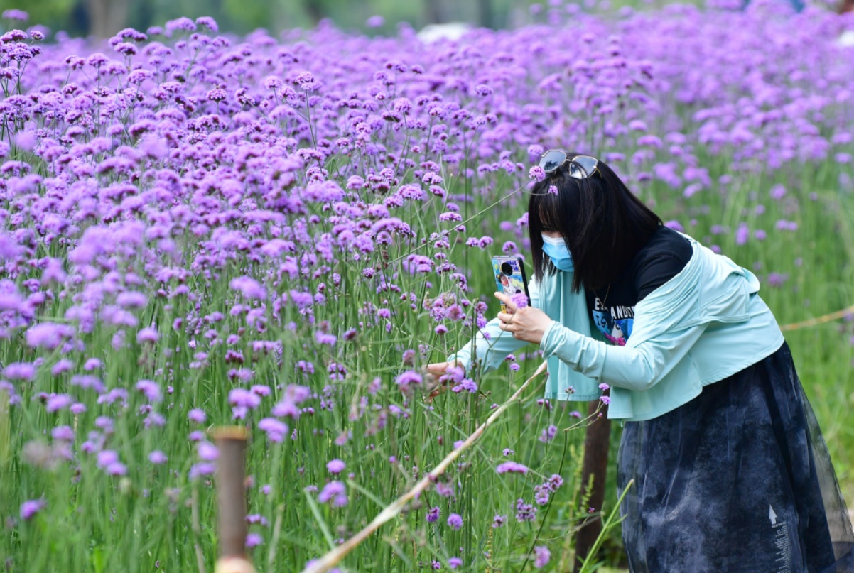 长江日报大武汉客户端5月21日讯 5月21日,在汉口江滩四期园区,成片的马鞭草花开成海。不少市民趁着双休结伴而来,拍照赏景,共度休闲好时光。