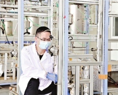 5月20日,中国地质大学(武汉)程寒松教授创办的武汉氢阳能源,拥有独特的氢气储运技术,一举突破了储运这个氢能最大的瓶颈。图为科研人员正在测试研发的催化剂。