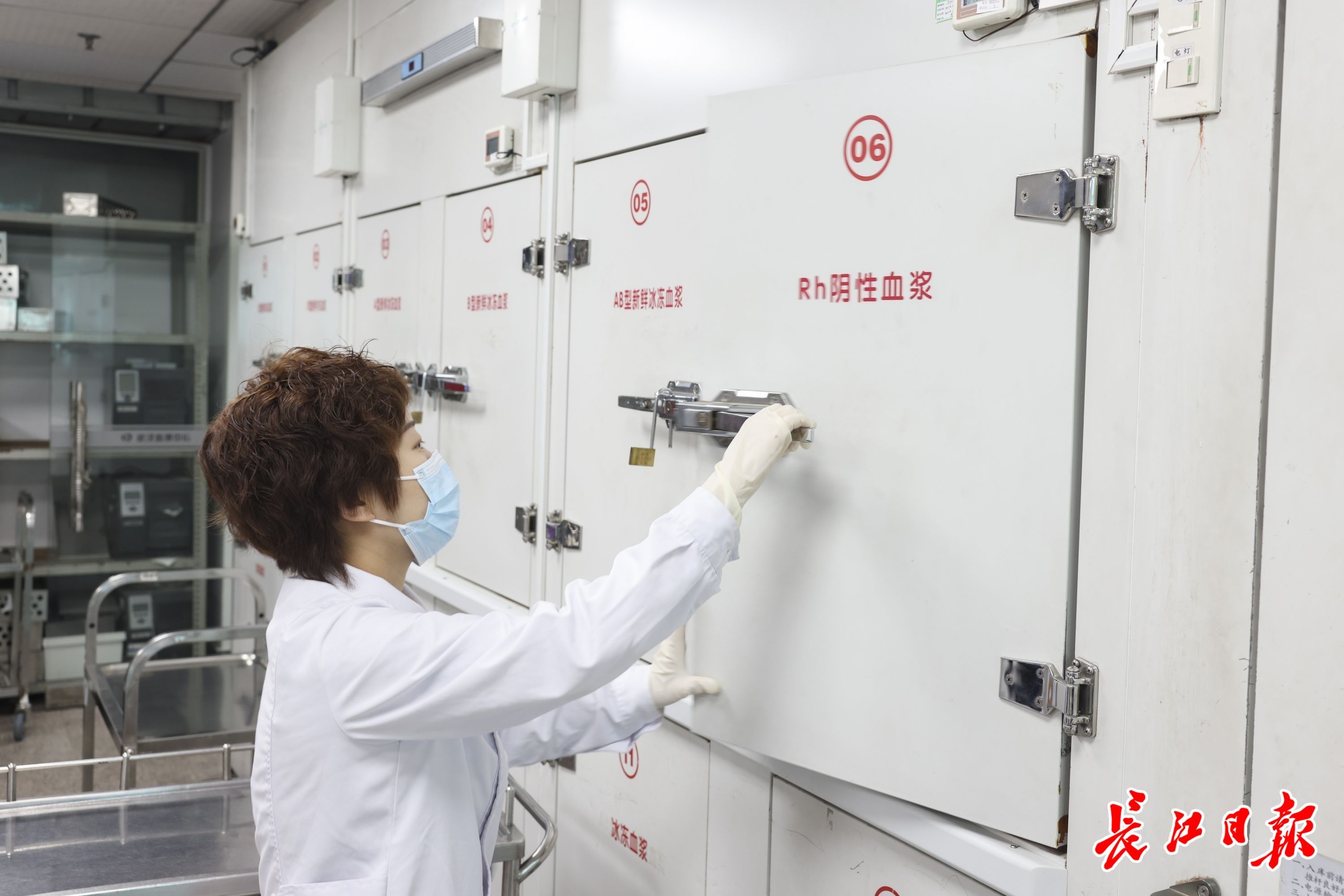 武汉市血液中心供血科,工作人员取用稀有血型血浆。 记者胡冬冬 摄