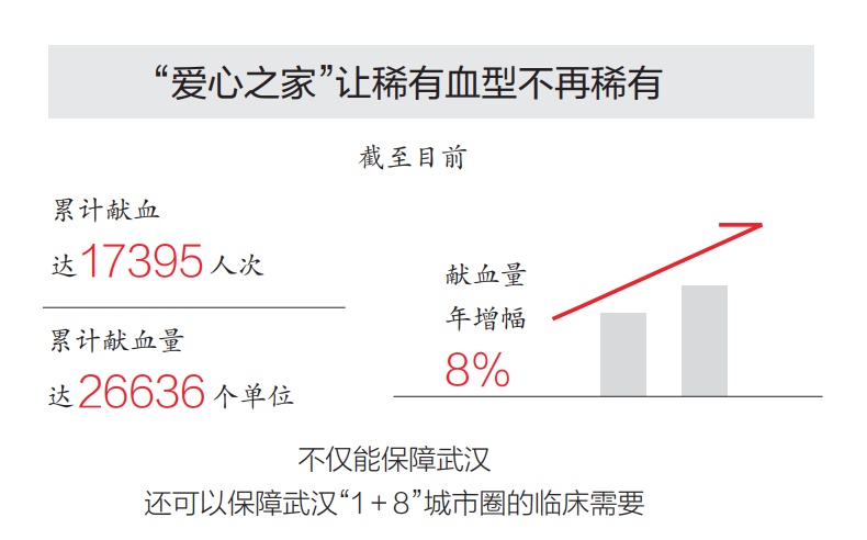 “爱心之家”自成立至今,武汉稀有血型无偿献血者累计献血达17395人次,累计献血量达26636个单位,献血量年增幅8%。不仅能保障武汉,还可以保障武汉“1+8”城市圈的临床需要。