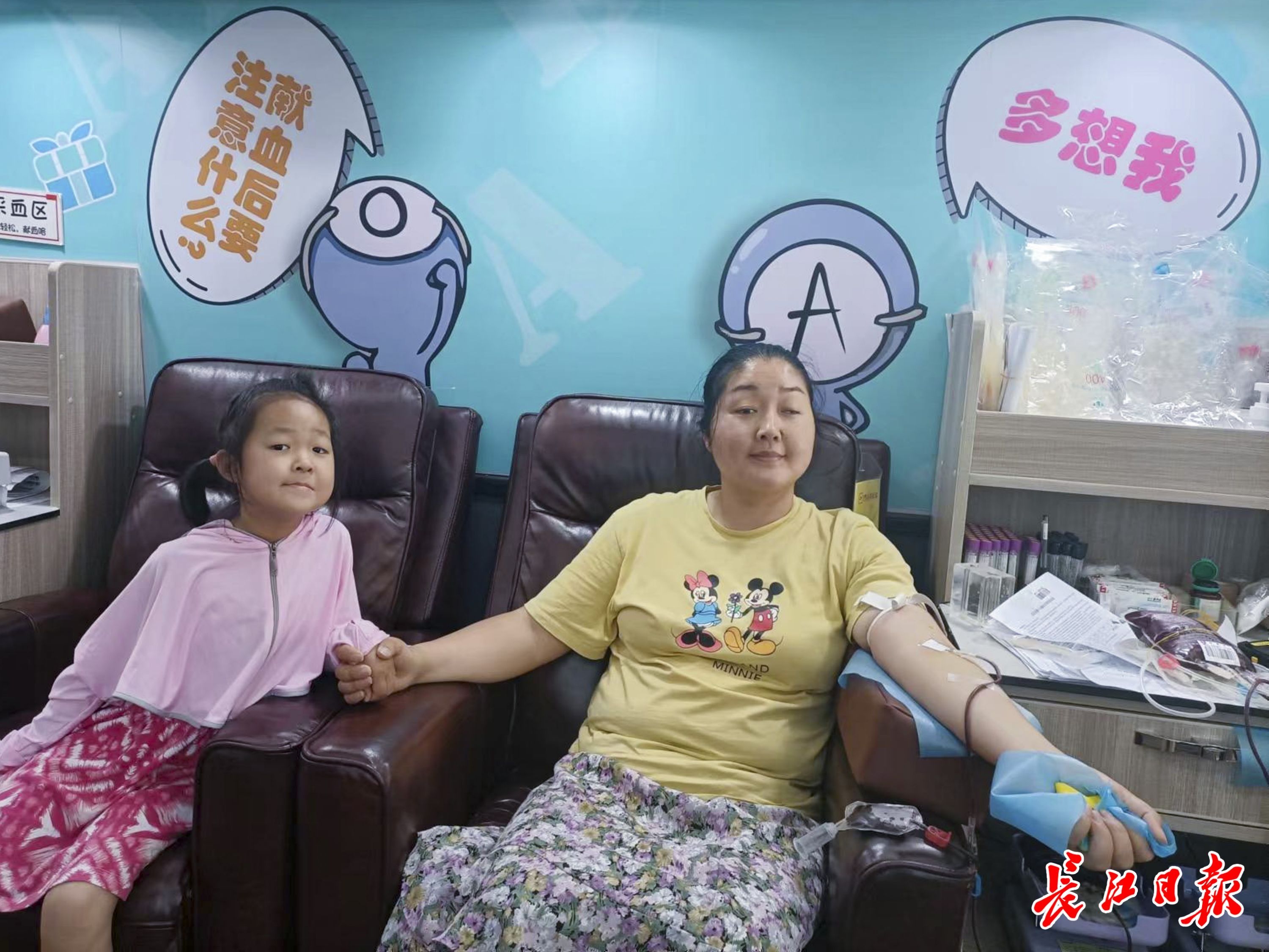 大女儿4岁后,孙翠红每次献血都会带上女儿。从第一次女儿看她扎针哇哇大哭,到现在女儿细心地跑前跑后现场照顾她,她认为这也是她作为一个母亲应该传给孩子的。