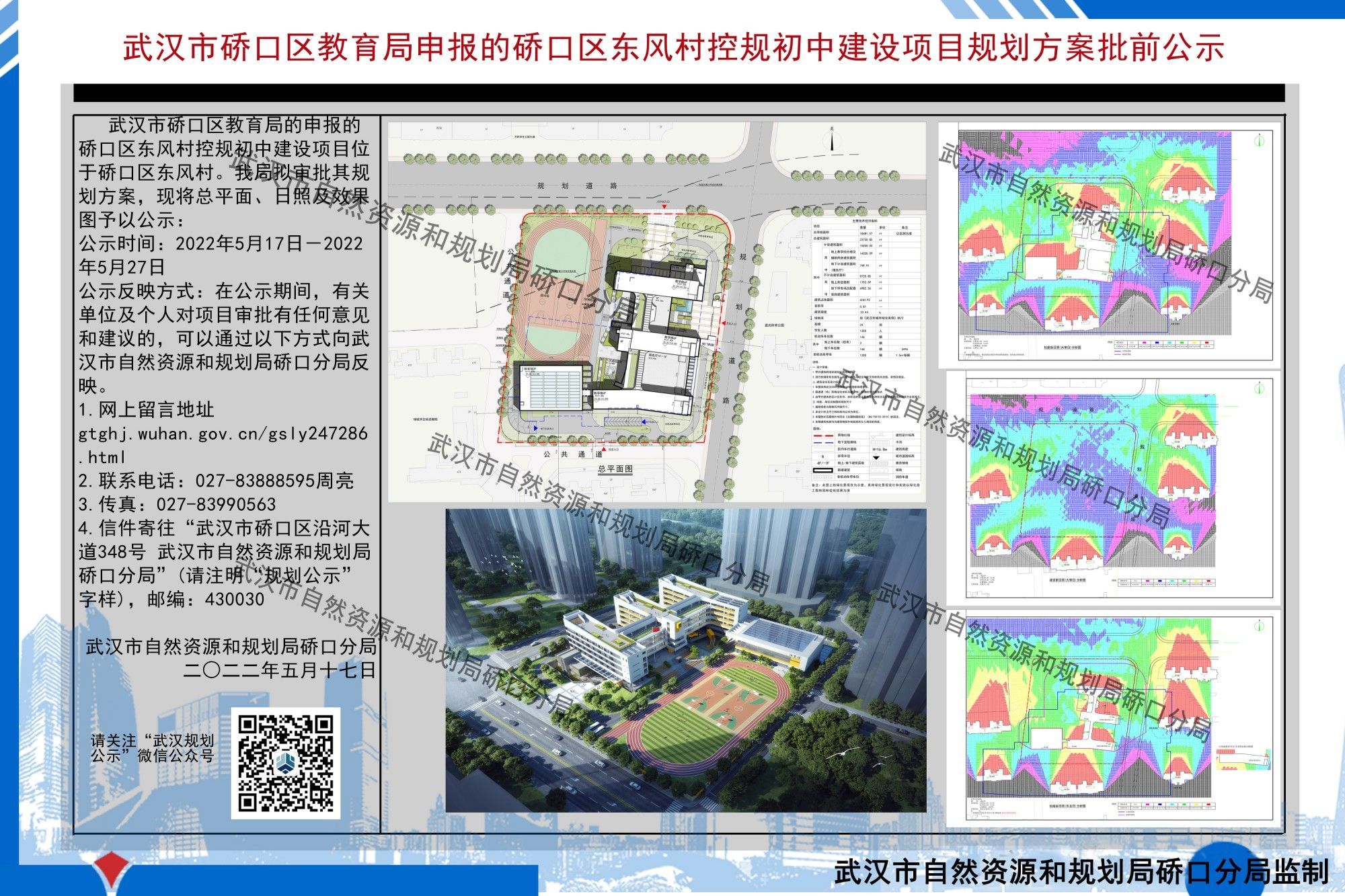 公示时间为2022年5月17日—2022年5月27日。有关单位或个人对该项目审批有任何意见或建议的,可在公示期间向武汉市自然资源和规划局硚口分局反映。