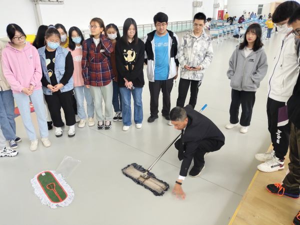 同学们除了认真听,有的还拿着笔记本一一记录清楚。武汉商学院食品科技学院大二学生张钦对各种拖把的用处感到特别好奇:“我原来真不知道拖地里还蕴含这么多知识。上一堂物业老师的劳动课,我确实能切身感受到劳动的不易。”