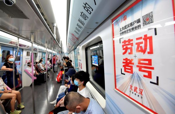 “劳动者号”专列展示长江日报和大武汉客户端。记者刘斌 摄