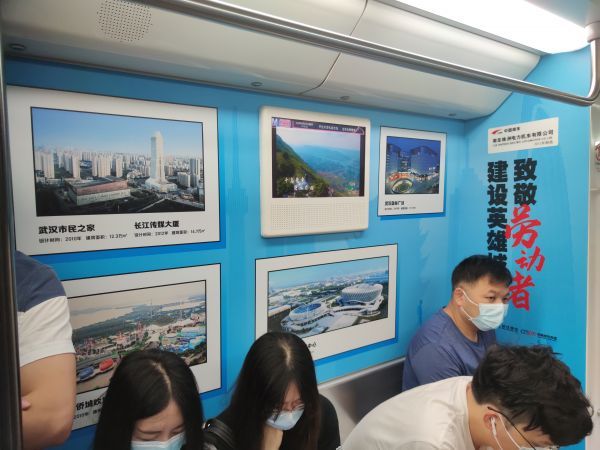 长江日报记者在车厢内看到,两侧分布着众多的建筑鸟瞰图、效果图,如湖北省图书馆、湖北剧院、琴台美术馆、武汉国际博览中心、国家网安基地、火神山医院……都是武汉最具代表性的地标,很多人一边扶着拉手一边细细观看。