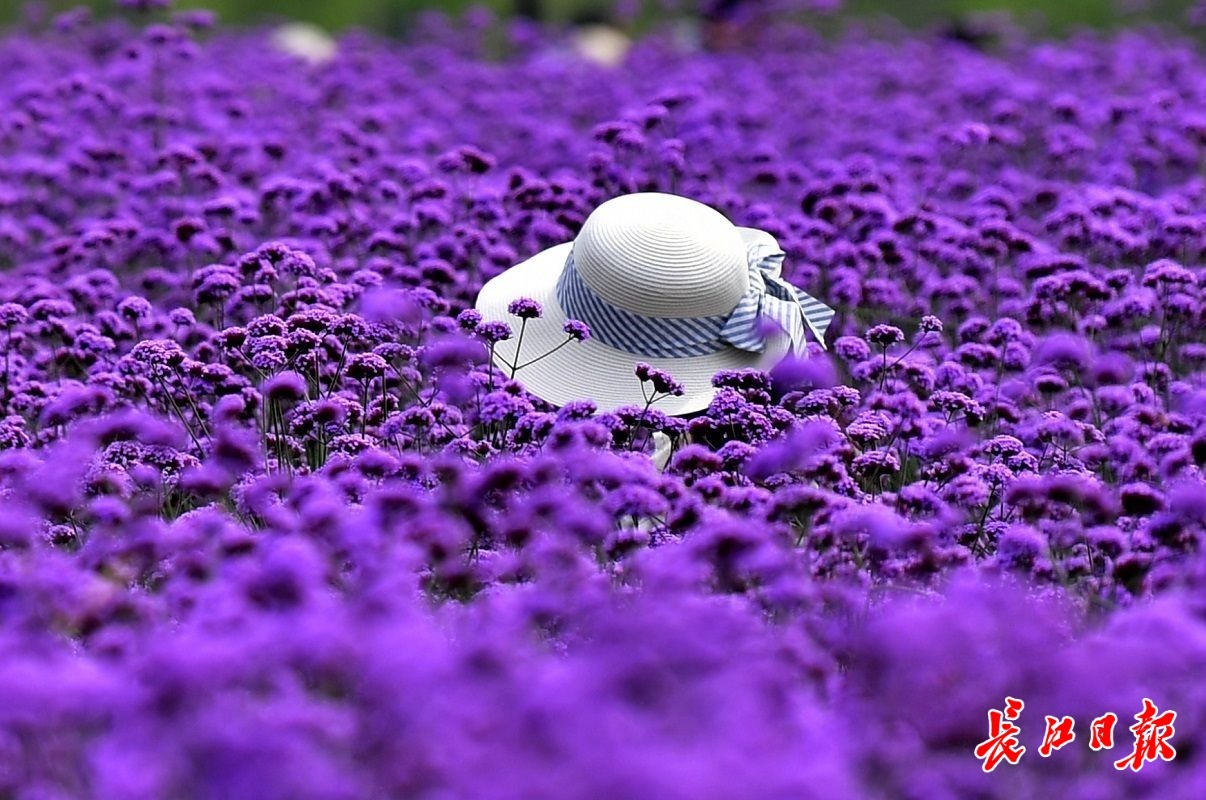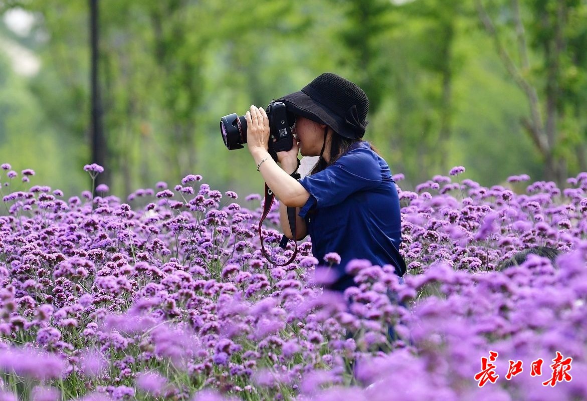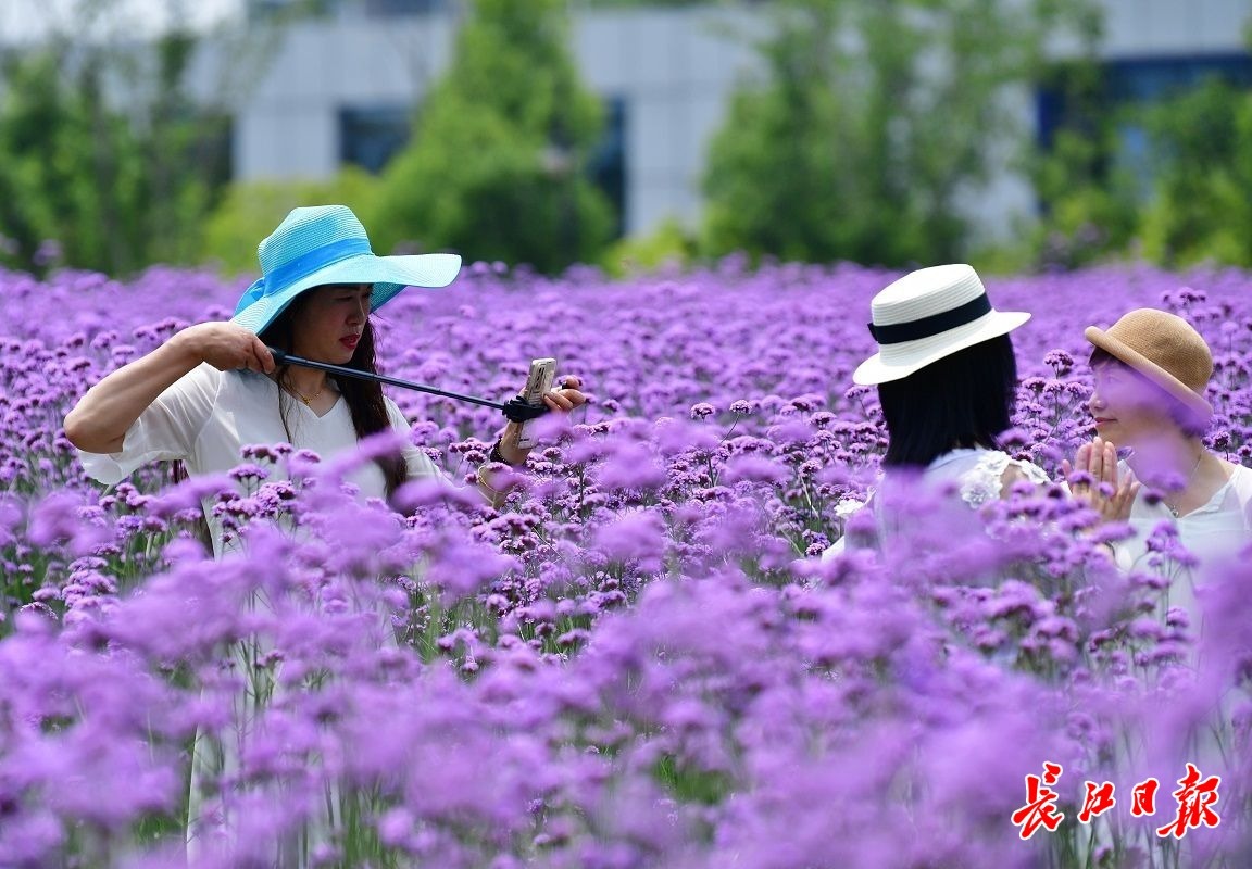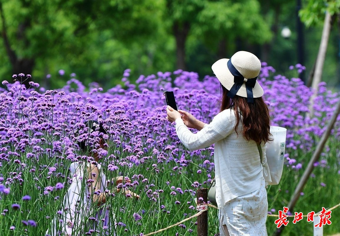 长江日报大武汉客户端5月22日讯 5月22日,在汉口江滩,成片的马鞭草吸引了不少市民前来打卡。爱美女士们戴着各式太阳帽,徜徉在花间小径,或拍照,或录视频,花美人靓,自成风景。(长江日报记者喻志勇 摄影报道)