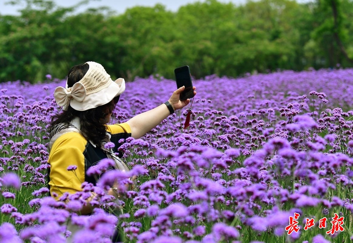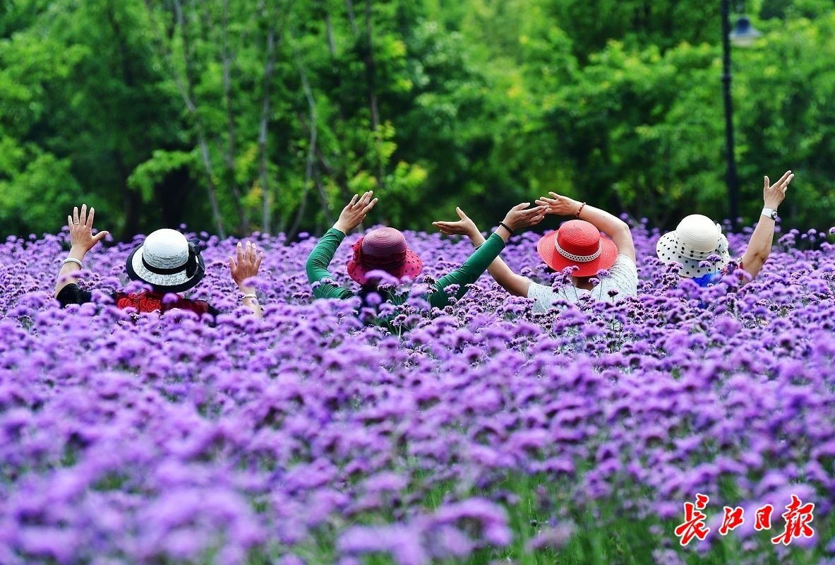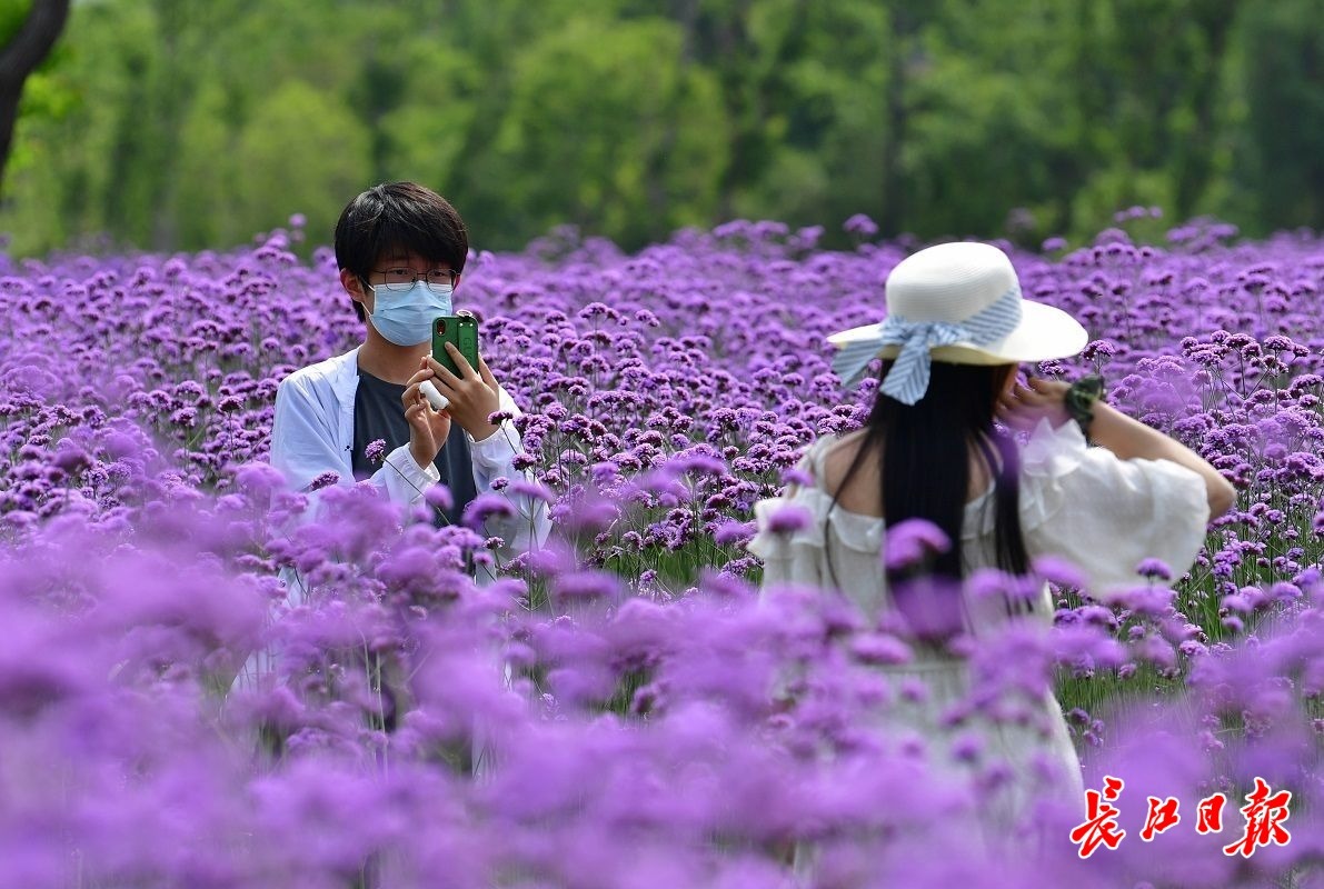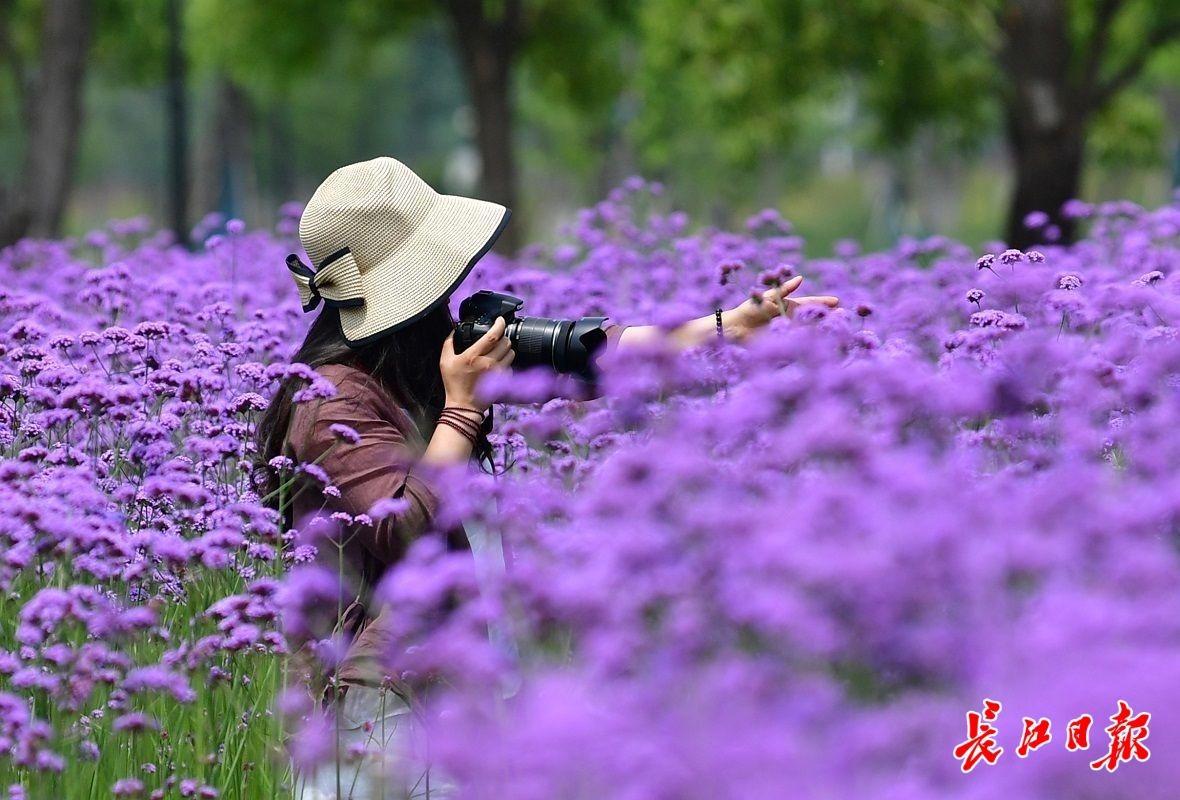 长江日报大武汉客户端5月22日讯 5月22日,在汉口江滩,成片的马鞭草吸引了不少市民前来打卡。爱美女士们戴着各式太阳帽,徜徉在花间小径,或拍照,或录视频,花美人靓,自成风景。(长江日报记者喻志勇 摄影报道)
