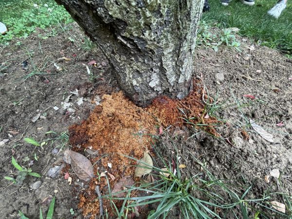 桃红颈天牛蛀食红叶李树干后排出的锯末状粪便。 通讯员兰玉婷 摄