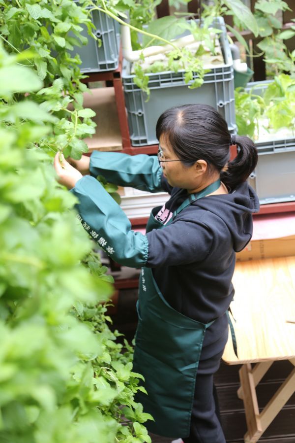 目前,她主要种植有生菜、小白菜、竹叶菜、辣椒、茄子、紫苏等10多个蔬菜品种。这其中,黄瓜、苦瓜藤,顺着庭院的栏杆不断攀爬,形成一道绿篱;待爬藤到头顶的花架,就形成一道“绿阳篷”。