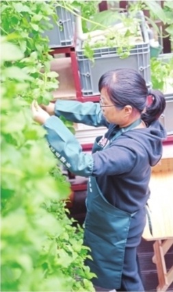 目前,她主要种植有生菜、小白菜、竹叶菜、辣椒、茄子、紫苏等10多个蔬菜品种。这其中,黄瓜、苦瓜藤顺着庭院的栏杆不断攀爬,形成一道绿篱;待爬藤到头顶的花架,就形成一道“绿阳篷”。