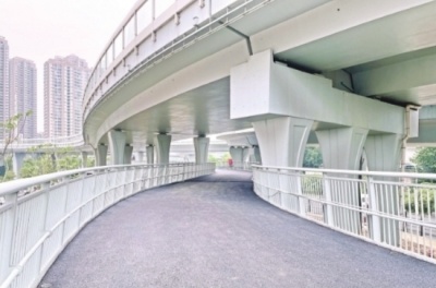 5月22日上午10时许,记者在张公堤绿道姑嫂树立交断点处看到,类似弓形的人行天桥已经建成,即将开通。在已经铺设好的沥青路面上,记者尝试走了一段路发现,路面非常平整,踩上去脚感舒适。
