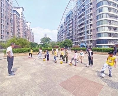 训练正式开始。15名孩子先热身,接着训练传球停球、颠球带球、带球绕杆等基本功。58岁的陈鹏南一边吹着口哨,一边指导孩子们做动作。社区没有大型绿茵场地,训练只能选在花坛中间的广场上进行,呐喊声、欢呼声、口哨声,现场一片火热。