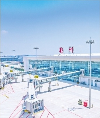 久雨逢晴,花湖机场航站楼前“鄂州”两个大字,在蓝天下显得格外耀眼。