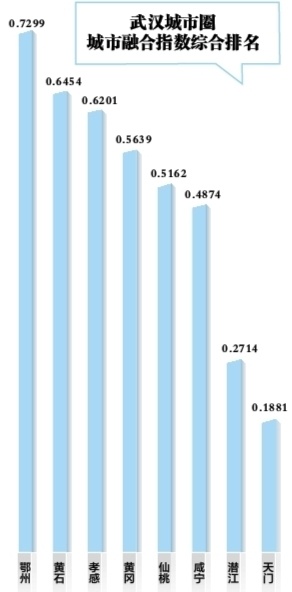 研究发现,八市融入城市圈城市融合指数综合排名为:鄂州、黄石、孝感、黄冈、仙桃、咸宁、潜江、天门。