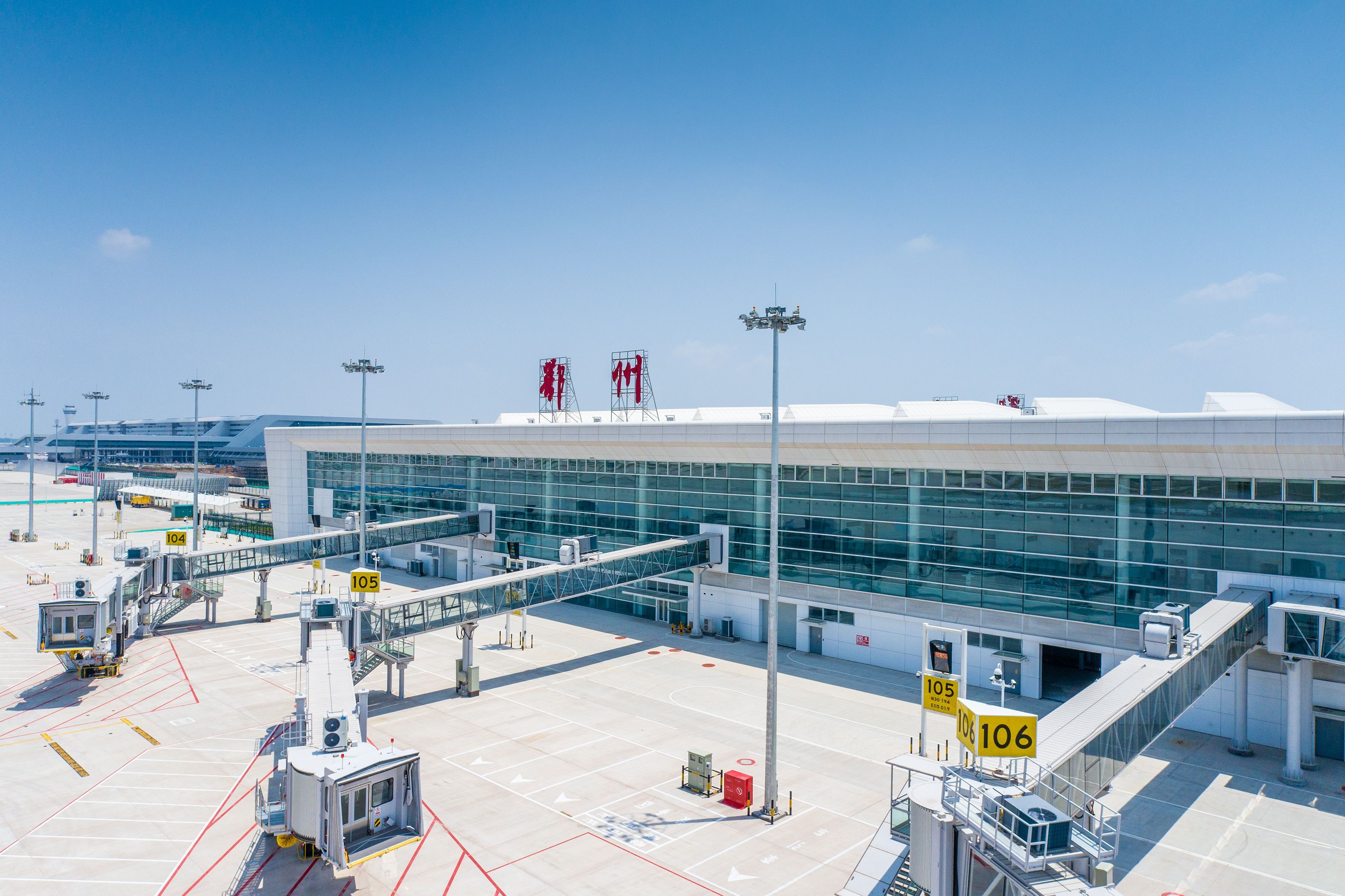 久雨逢晴,花湖机场航站楼前“鄂州”两个大字,在蓝天下显得格外耀眼。