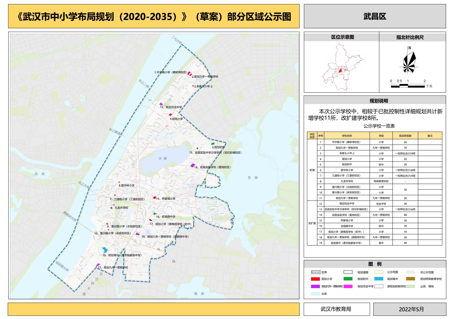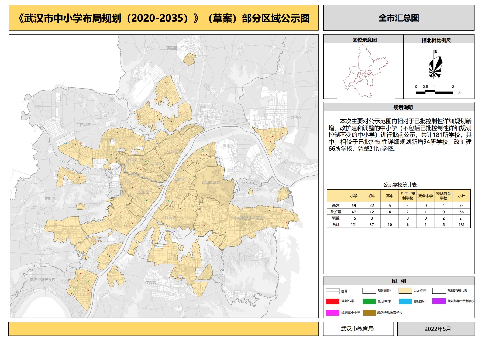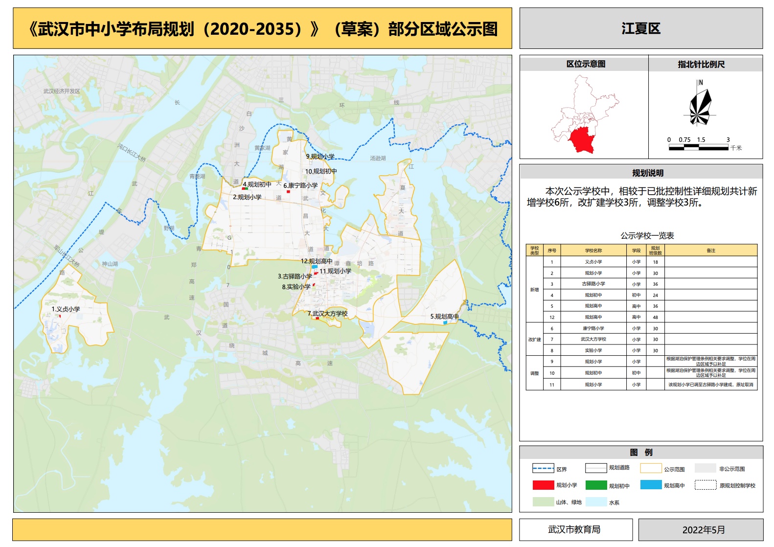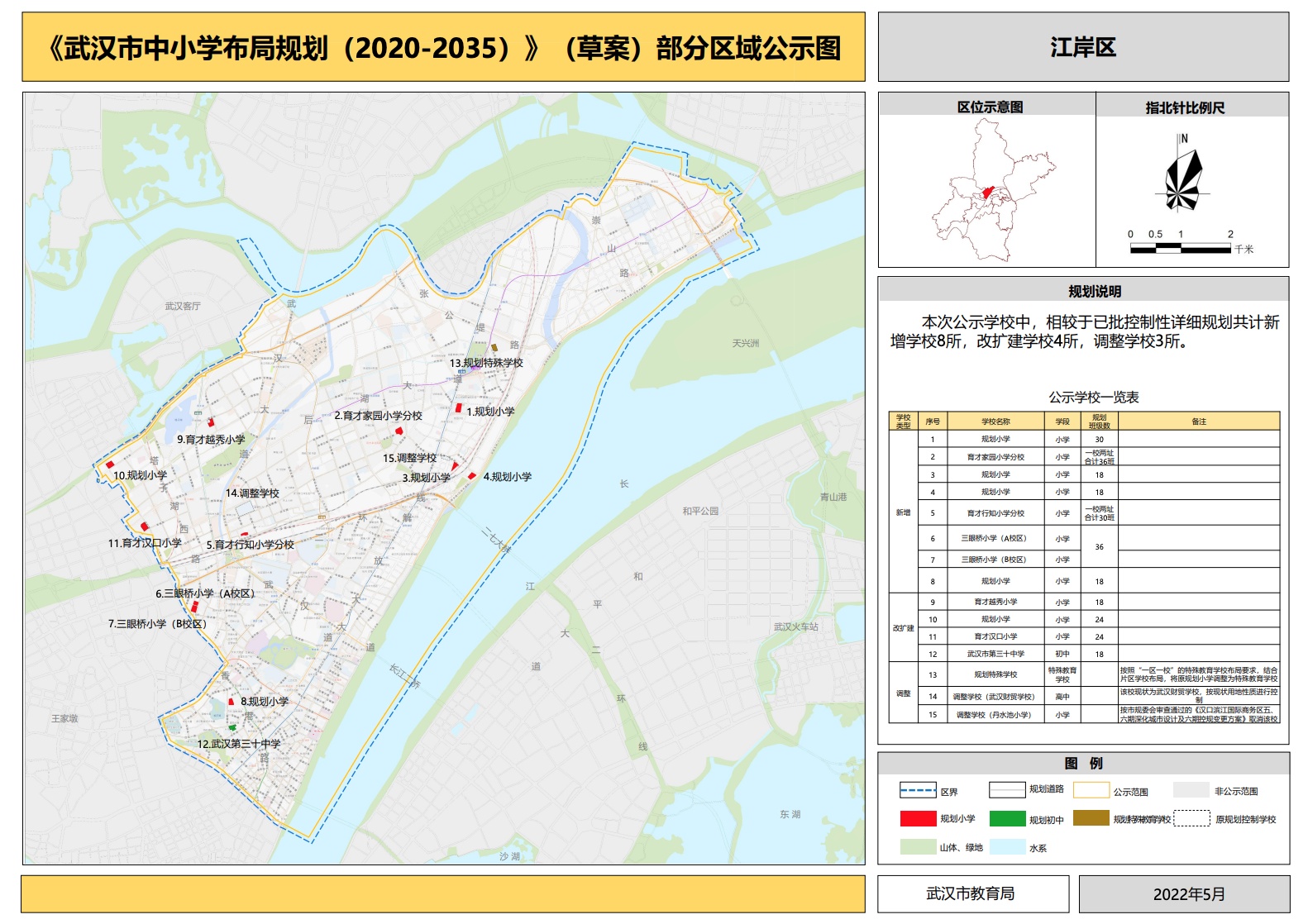 《武汉市中小学布局规划(2020—2035年)》(草案)结合了《武汉市国土空间总体规划(2021—2035年)》(草案)的相关要求,在原编制《武汉市普通中小学布局规划(2013—2020年)》基础上组织编制而成。本次批前公示范围为《武汉市中小学布局规划(2020—2035)》(草案)部分区域,其他区域由于相关规划正在调整,不纳入本次公示范围。