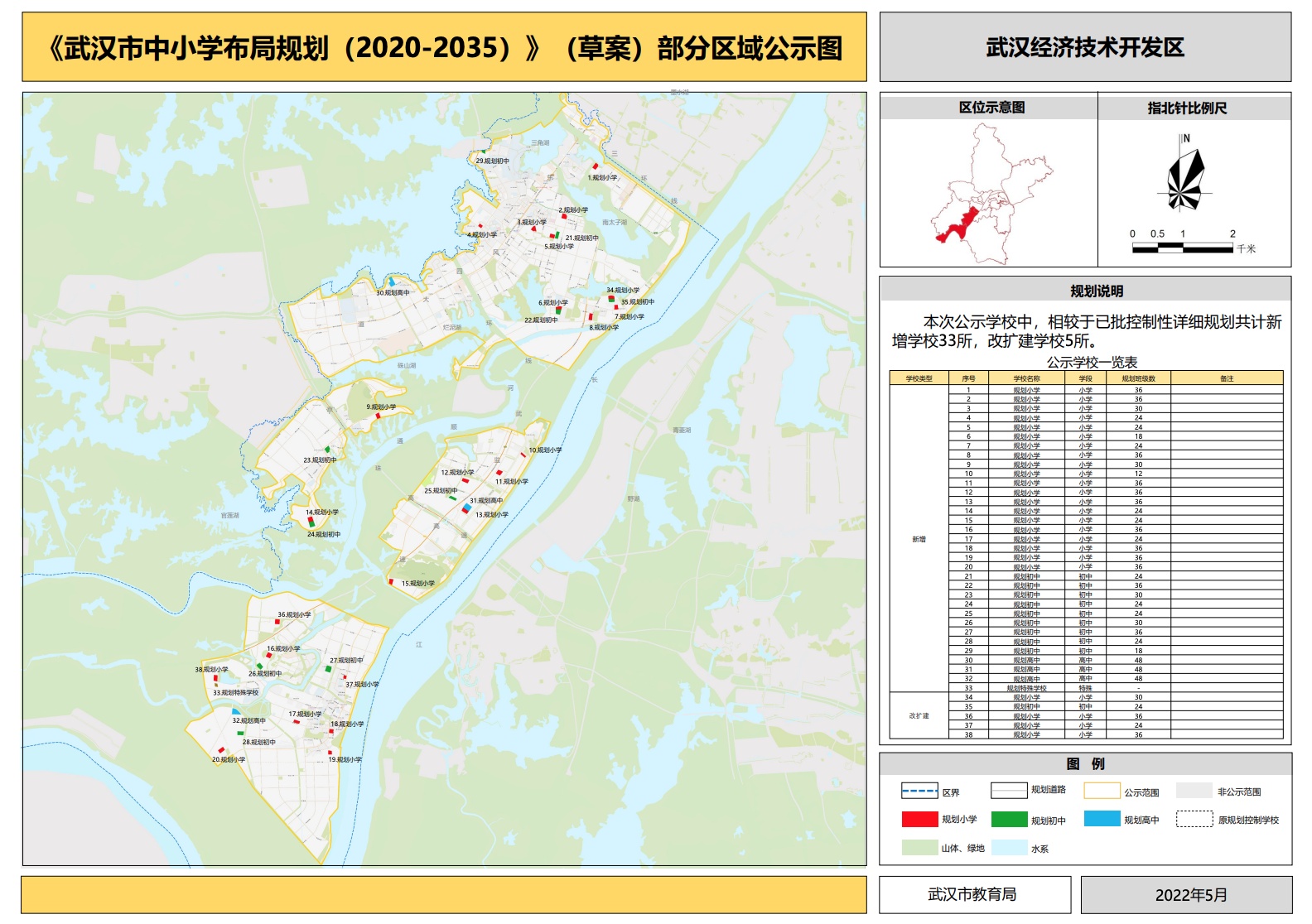 根据公告,记者发现,此次公示的区域中,武汉经济技术开发区新增学校数量最多,相较于已批控制性详细规划共计新增学校33所,改扩建学校5所。