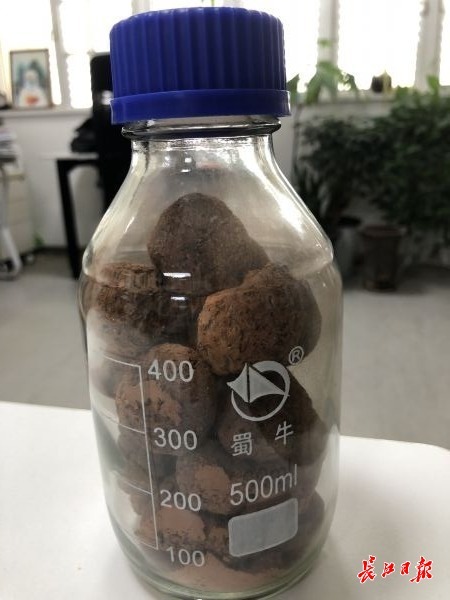 湖底底泥通过高温烧结后变成像核桃一样的陶粒样品。 记者胡义华 摄