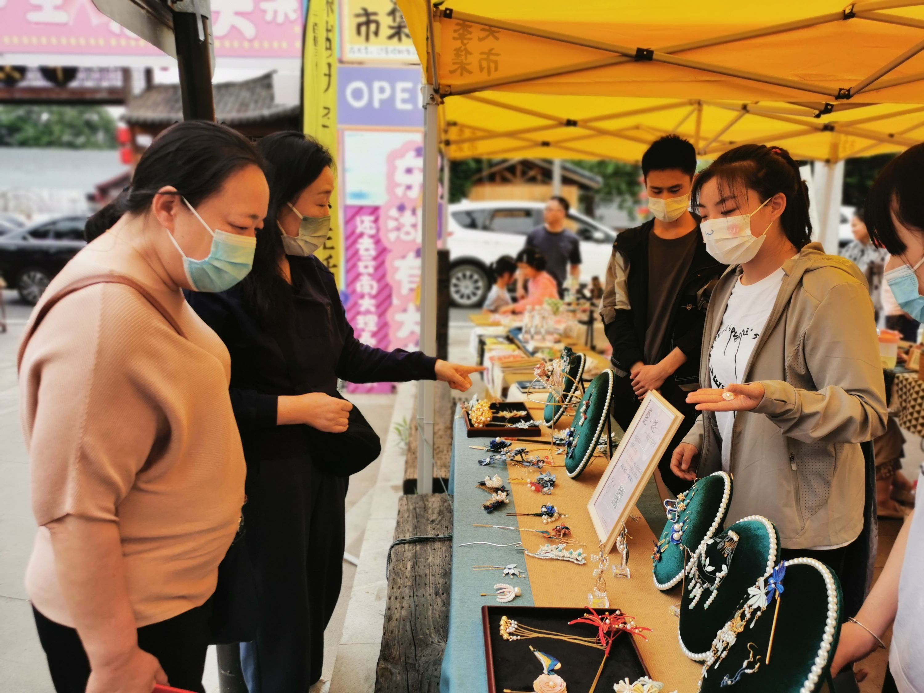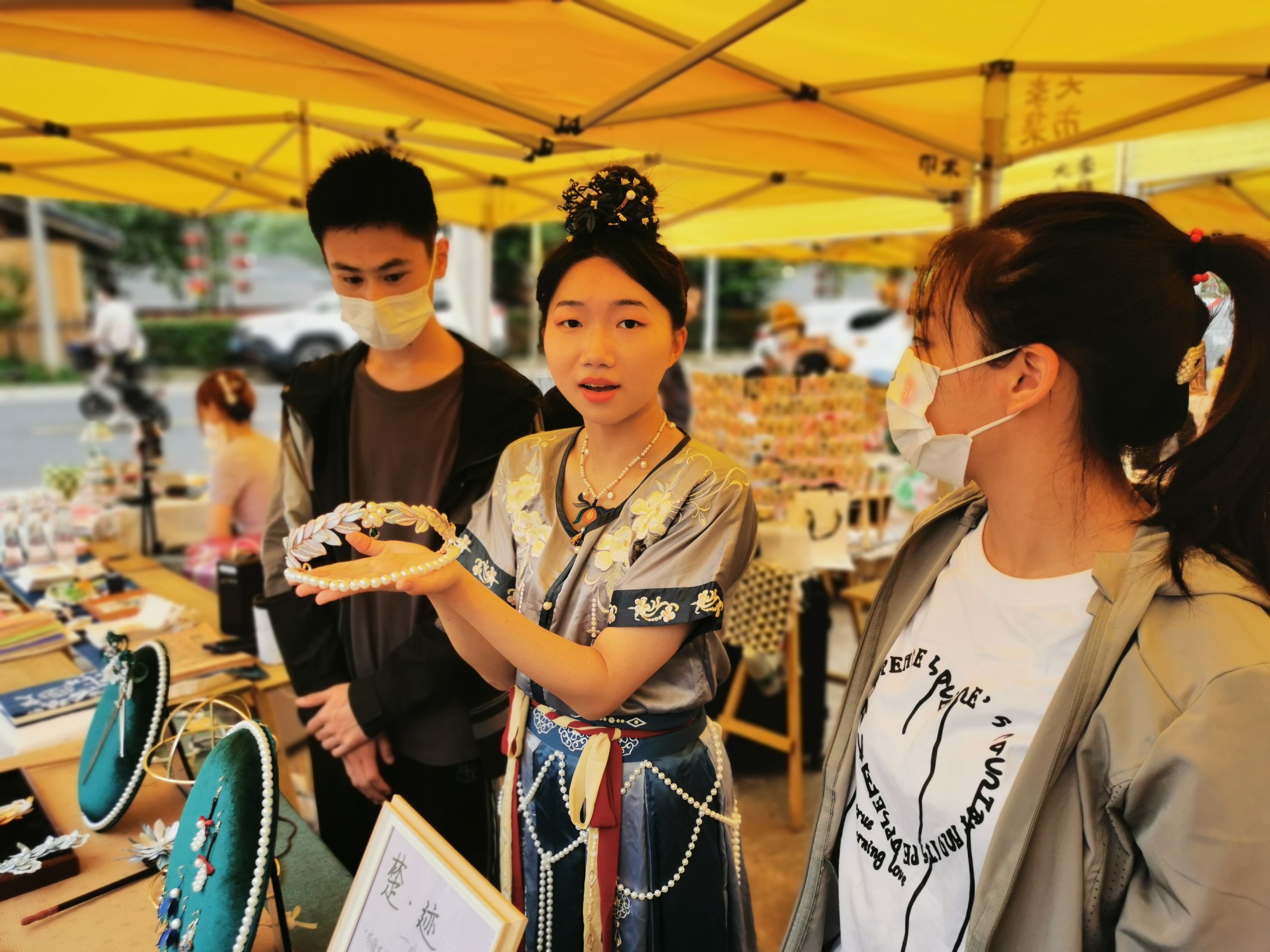 “楚·迹”摊位上,一个缀满了花瓣和珍珠的金黄花冠吸引了不少游客驻足。“它是复刻改良后的隋朝闹蛾扑花冠,适合搭配礼服,我常从传统经典中寻找创作灵感。”18岁的周烝羽告诉记者,得知大李生活节在招募摊主后,他们一行四人特意前来“摆摊”,“来市集更重要的是为专业学习积攒经验,让更多人知道这门传统工艺。”