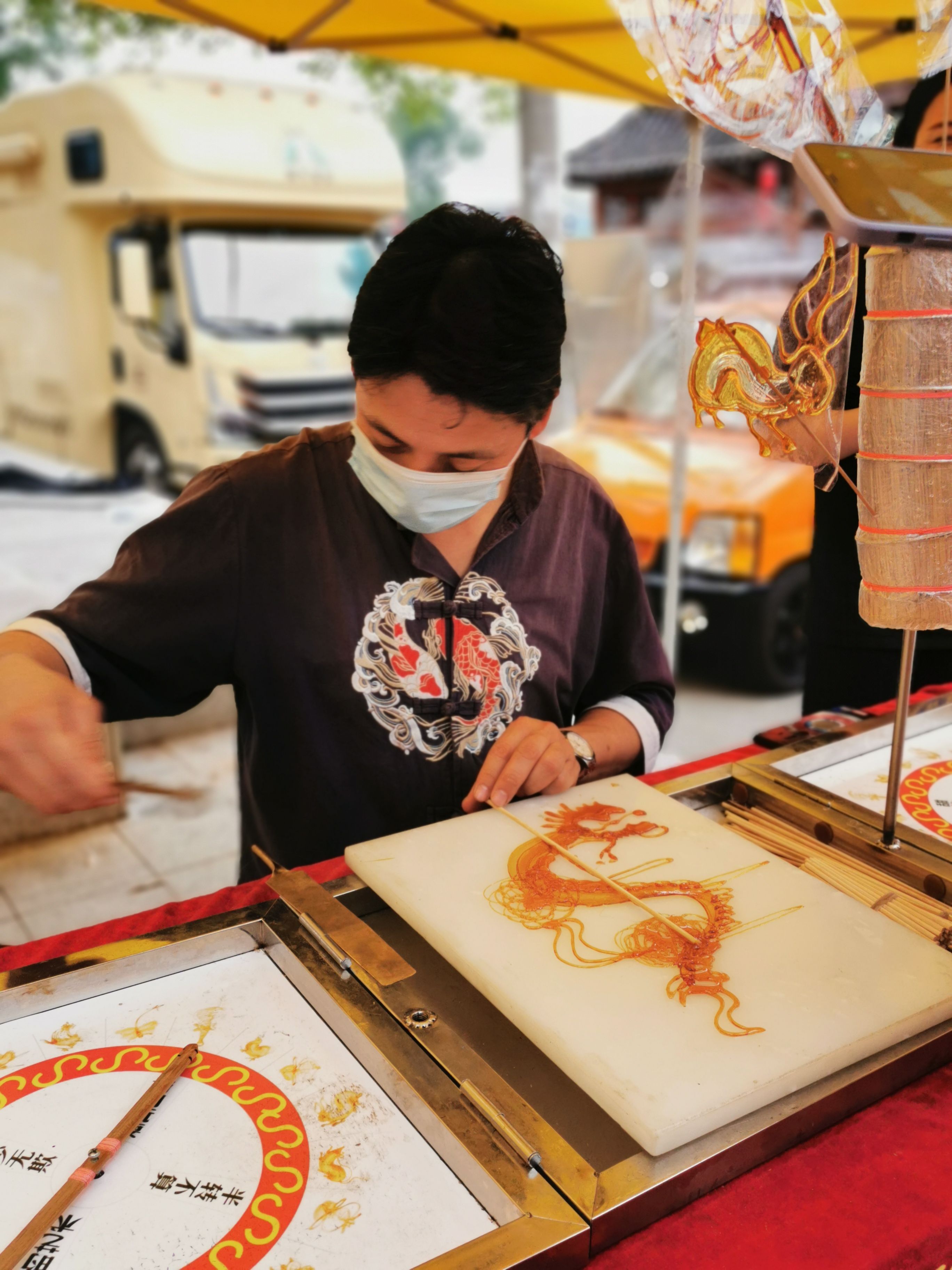 另一旁的非遗糖画摊位被孩子们紧紧围绕,只见糖画师的手飞快舞动,数十秒钟,一勺糖稀通过糖画师付师傅之手,变成了栩栩如生的祥龙。在摊位上,还有刚制作好的飞禽走兽,活灵活现,惹得过往行人频频驻足。