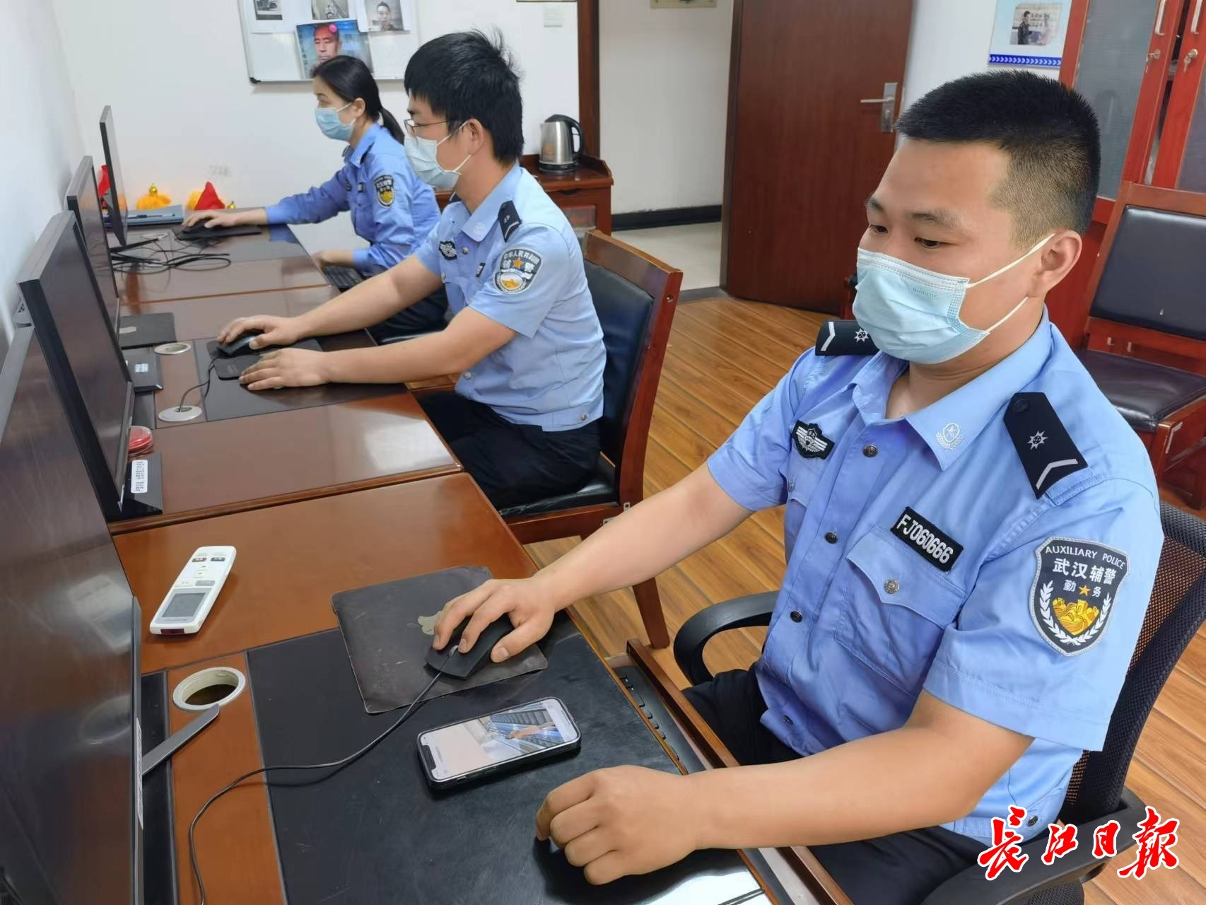 辅警刘胜(右一)在工作中。 记者戴旻阳 摄