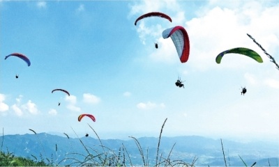 戴好头盔,双手攥紧伞绳,廖灿闭上眼睛,用脸上的皮肤去感受风的强度。时机成熟,她拉着滑翔伞顺着山坡用力向下奔跑,等伞张开后转身收腿,轻轻一跃,熟悉的失重感瞬间传来,一顶蓝紫相间的滑翔伞如同双翼,载着她在700米高空翱翔,装在头盔和脚踝处的运动相机会自动将她看到的美景如实记录下来。