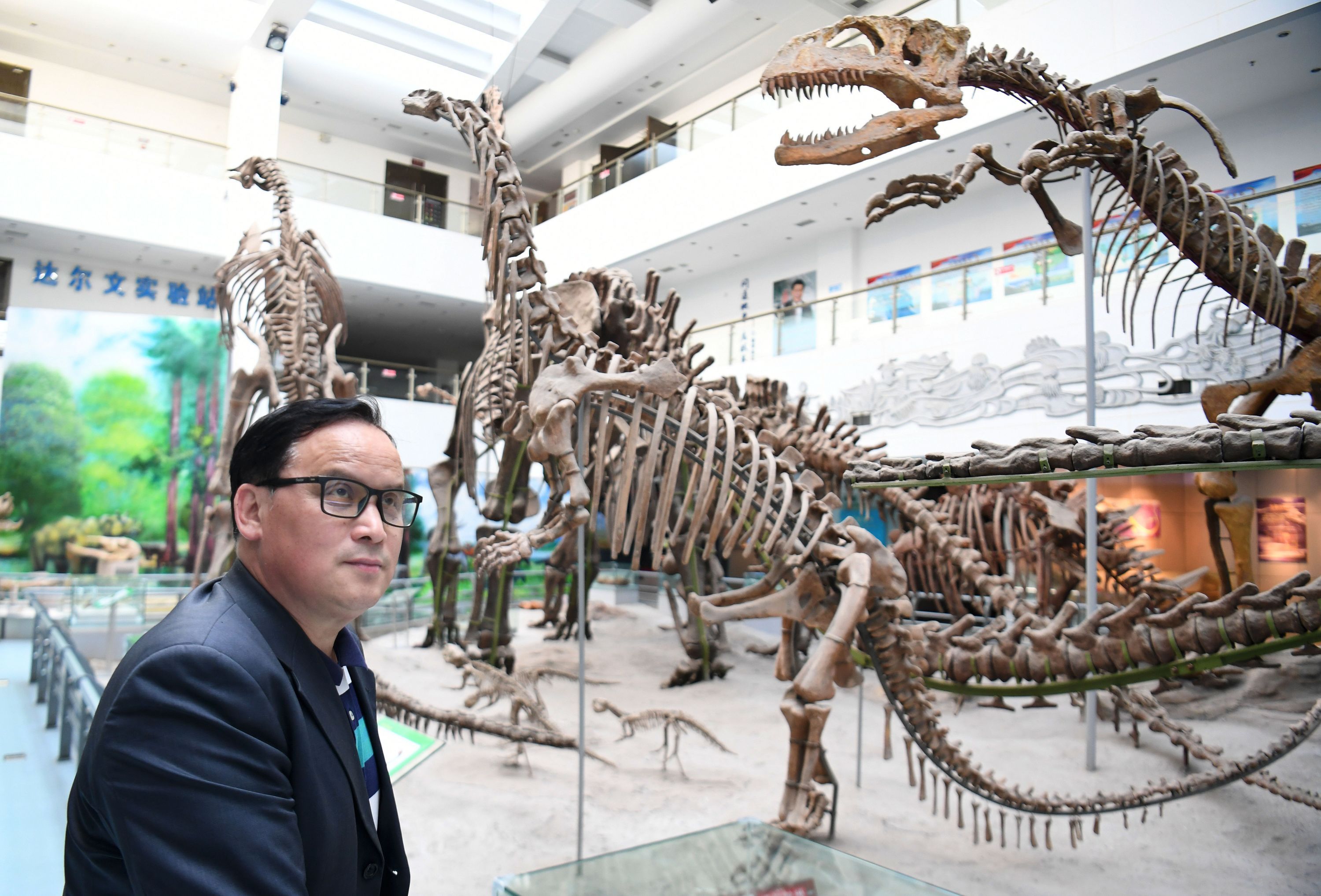 5月16日,徐世球教授在地大逸夫博物馆恐龙化石前。长江日报记者高勇 摄