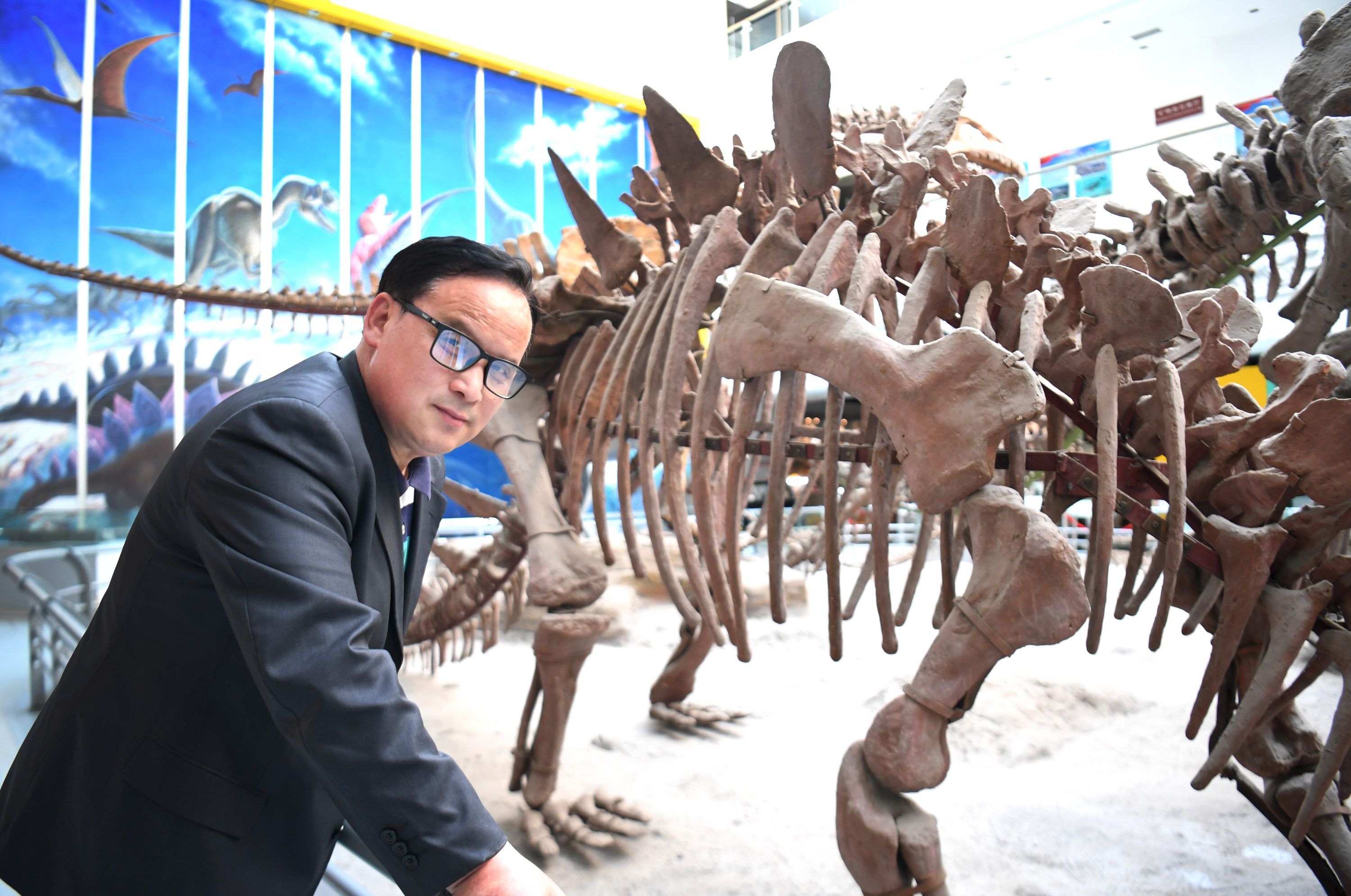 这具长10米、高6米、重10吨的巨型恐龙骨架是徐世球和同事们亲手修复上色、拼装上架的。当时正值夏天,一群老爷们赤膊上阵,扛着恐龙化石攀高爬低,“像给《侏罗纪公园》布设场景,很过瘾”,徐世球说。