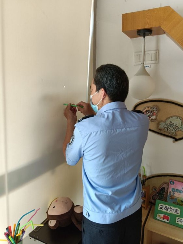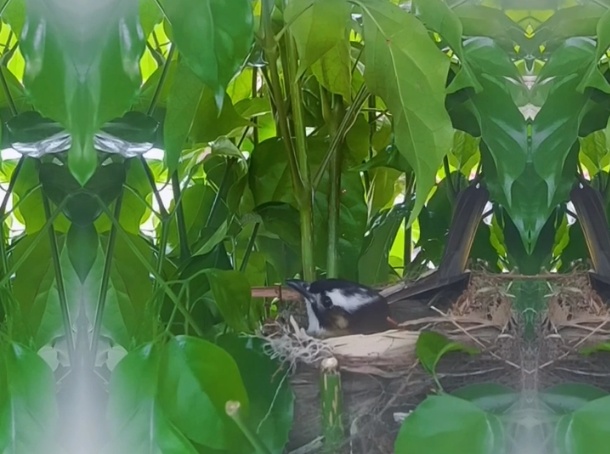 叶安林师傅说,5月初,一只白头翁鸟到幼儿园教学楼门前的矮树下搭窝筑巢,由于矮树靠近教学楼的透明玻璃门,一是担心孩子们观鸟拥挤在玻璃门前有安全隐患,二是小鸟也会因此受惊飞走。叶安林师傅琢磨了几天,找了一个大KT板遮挡玻璃门,又在KT板处细心地设计了不同高度的观鸟孔,方便不同身高的孩子们通过小孔观察鸟儿一家。