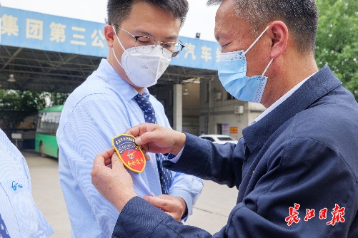 张兵正在为现任531司机戴上安全值日臂章。 长江日报记者吴思 摄